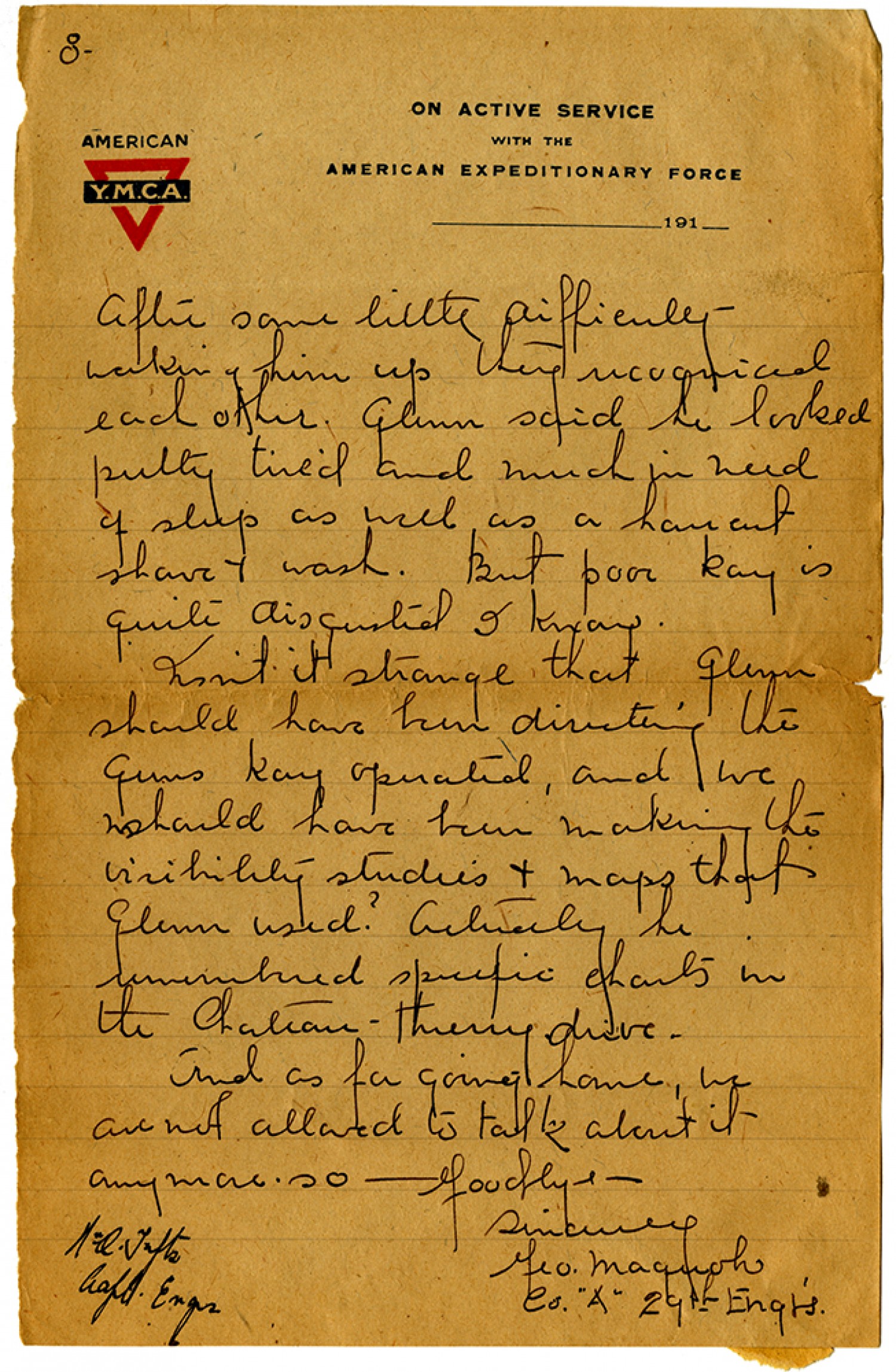 [page 8] After some little difficulty waking him up they recognized each other. glenn said he looked pretty tired and much in need of sleep as well as a hair cut shave & wash. But poor Ray is quite disgusted I know. Isn’t it strange that glenn should have been directing the guns Ray operated, and we should have been making the visibility studies & maps that glenn used? Actually he remembered specific charts in the Chateau – Thierry drive. And as for going home, we are not allowed to talk about it anymore so – Goodbye – Sincerley [George] Maguolo Co. “A” 29th [Engineers.] [censor’s signature]