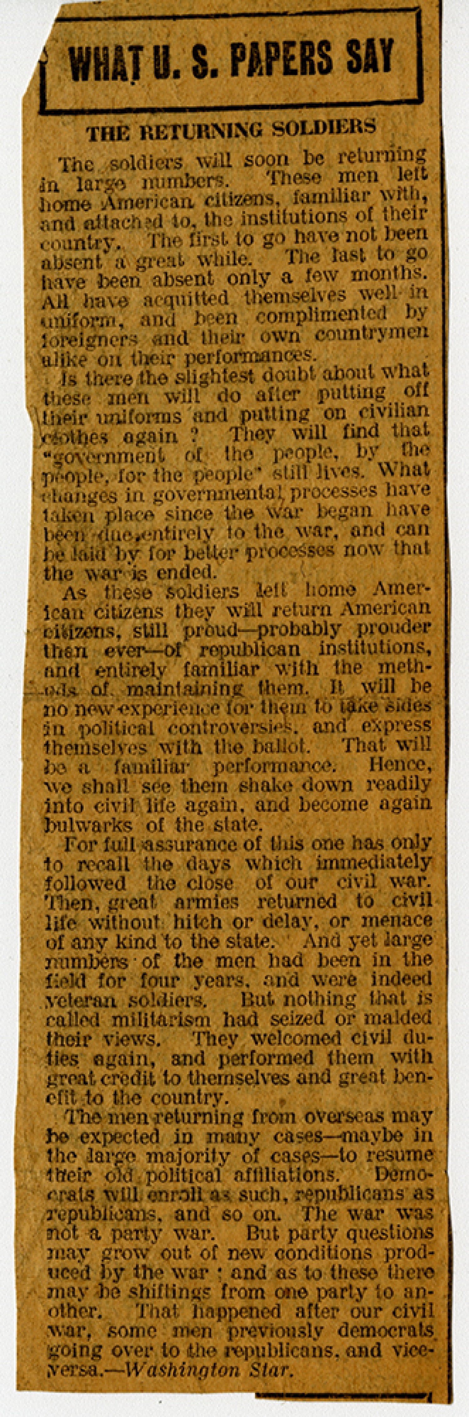 [newspaper clipping] What U. S. Papers Say The Returning Soldiers