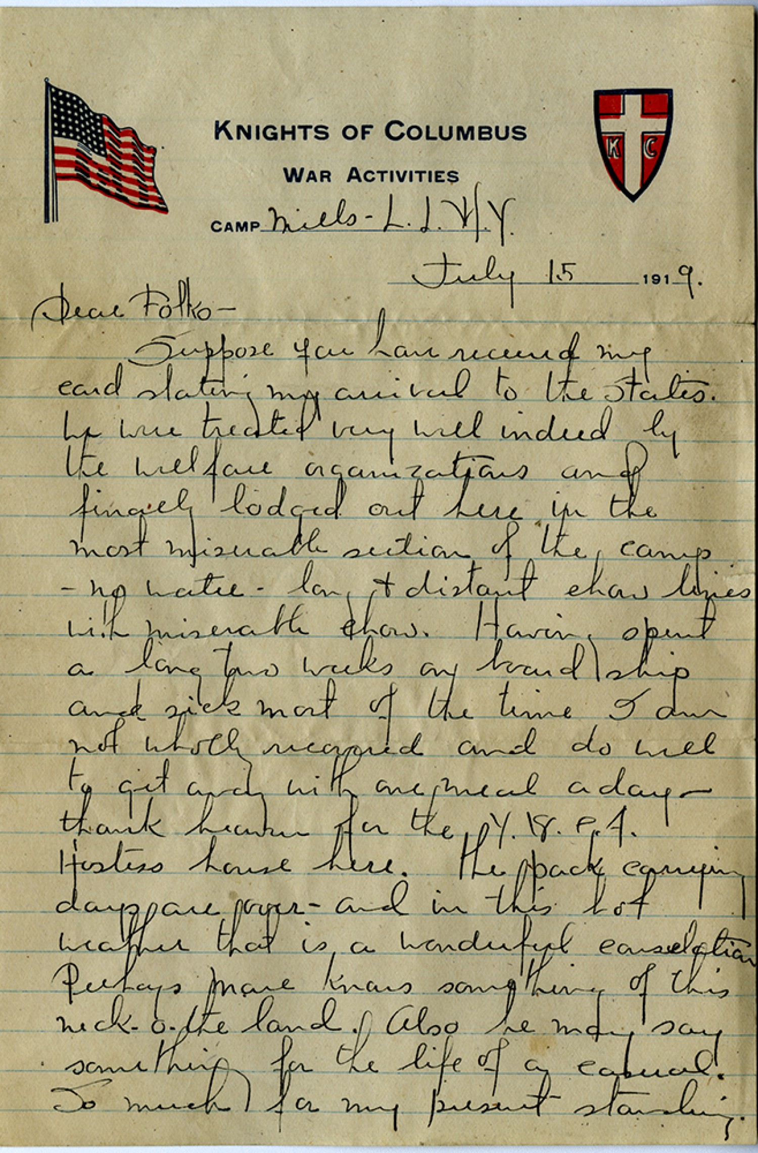 Camp Mills [Long Island, New York] July 15, 1919. Dear Folks - Suppose you have received my card stating my arrival to the States. We were treated very well indeed by the welfare organizations and finally lodged out here in the most miserable section of the camp – no water. Long & distant chow lines with miserable chow. Having spent a long two weeks on board ship and sick most of the time I am not wholly recovered and do well to get away with one meal a day – thank heaven for the Y.M.C.A. Hostess house here. the pack carrying days are over – and in this hot weather that is a wonderful conselation Perhaps Mare knows something of this neck–o-the land. Also he may say something for the life of a casual. So much for my present standing.
