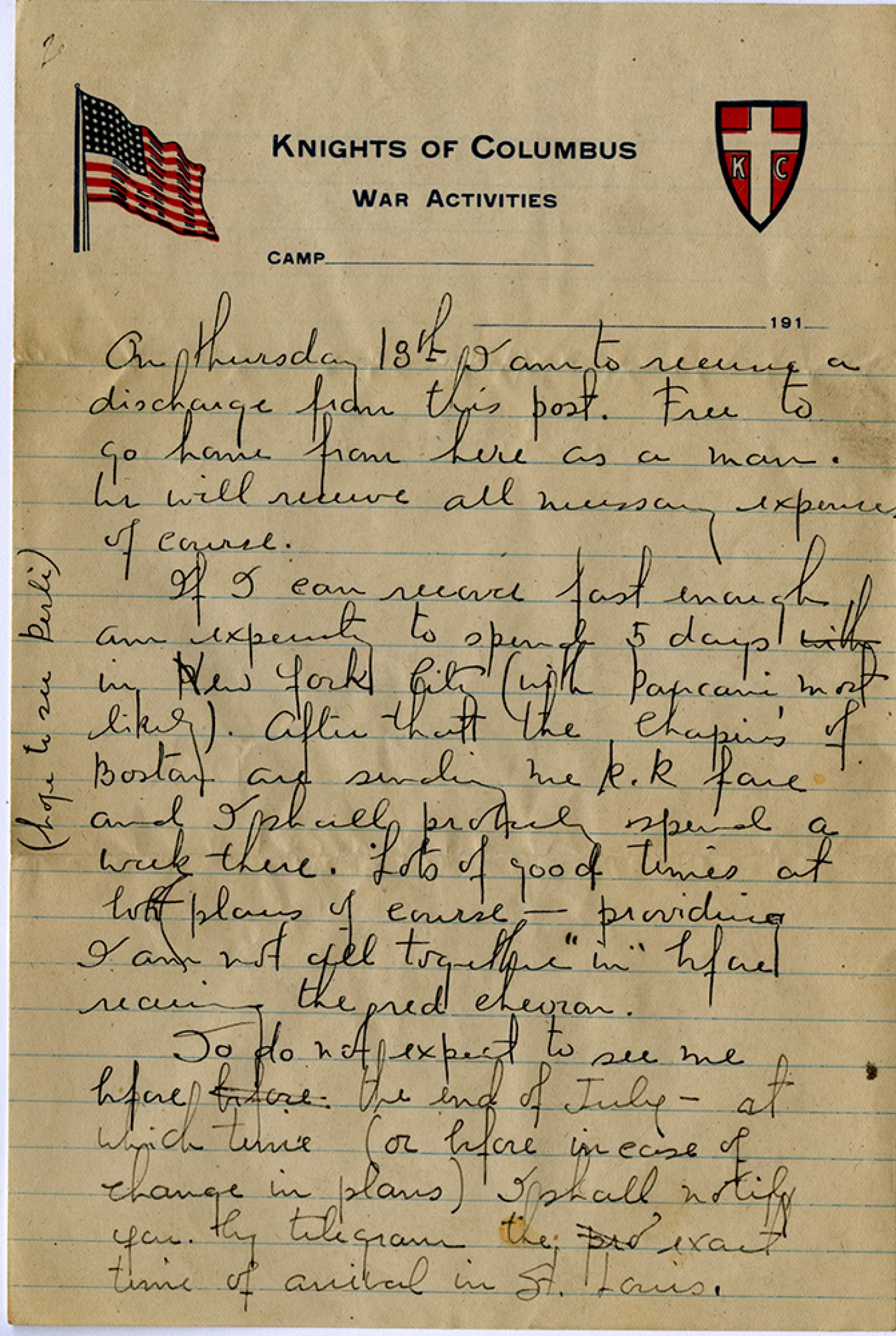 | Description | George J. Maguolo wrote a letter to his Folks July 15, 1919 while in France. Maguolo was in the 29th Engineers Company A and served in France until 1919. In this letter Maguolo wrote that he was back in the U.S and stationed at Camp Mills in Long Island, New York. Maguolo also discussed his return trip to the U.S. and the conditions at the camp. This letter was written on Knights of Columbus letterhead. |