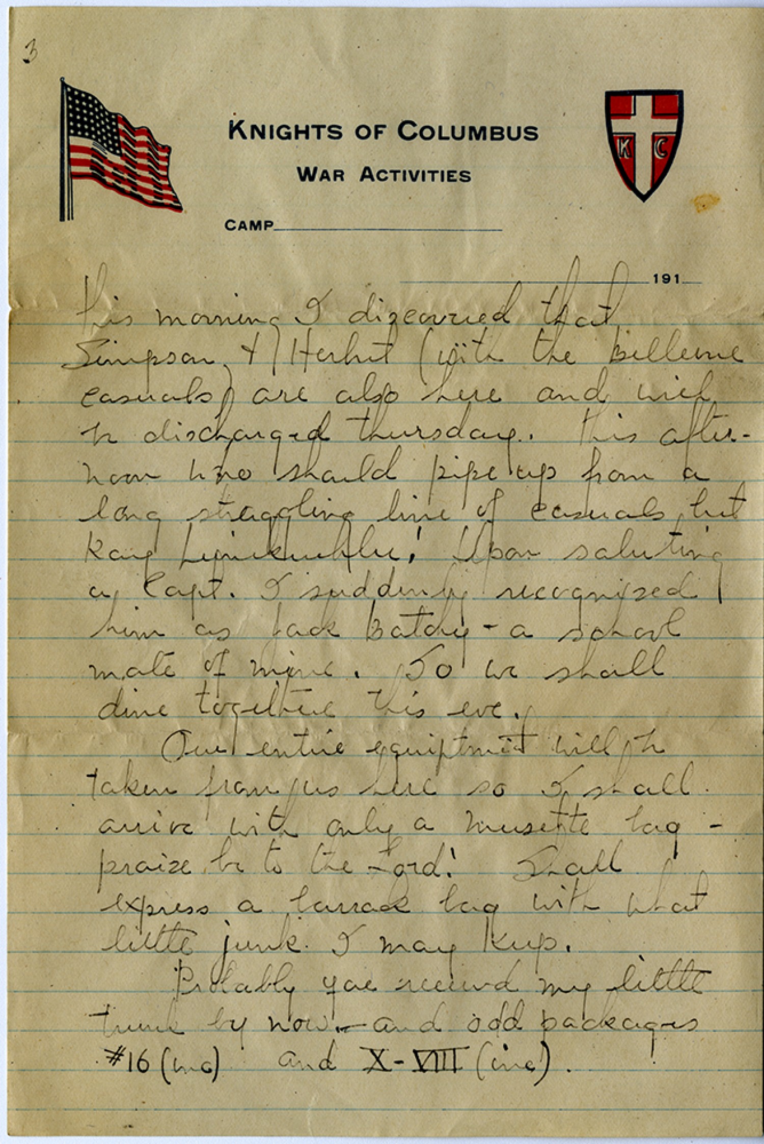 [page 3] this morning I discovered that Simpson & Herbert (with the Bellevue casuals) are also here and will be discharged thursday. this afternoon who should pipe up from a long straggling line of casuals but Ray Linikuehlu! Upon saluting a Capt. I suddenly recognized him as Jack Batchy – a school mate of mine. So we shall dine together this eve. Our entire equipment will be taken from us here so I shall arrive with only a musette bag – praise be to the Lord! Shall express a barrack bag with what junk I may keep. Probably you received my little trunk by now – and odd packages #16 and X-VIII (inc).