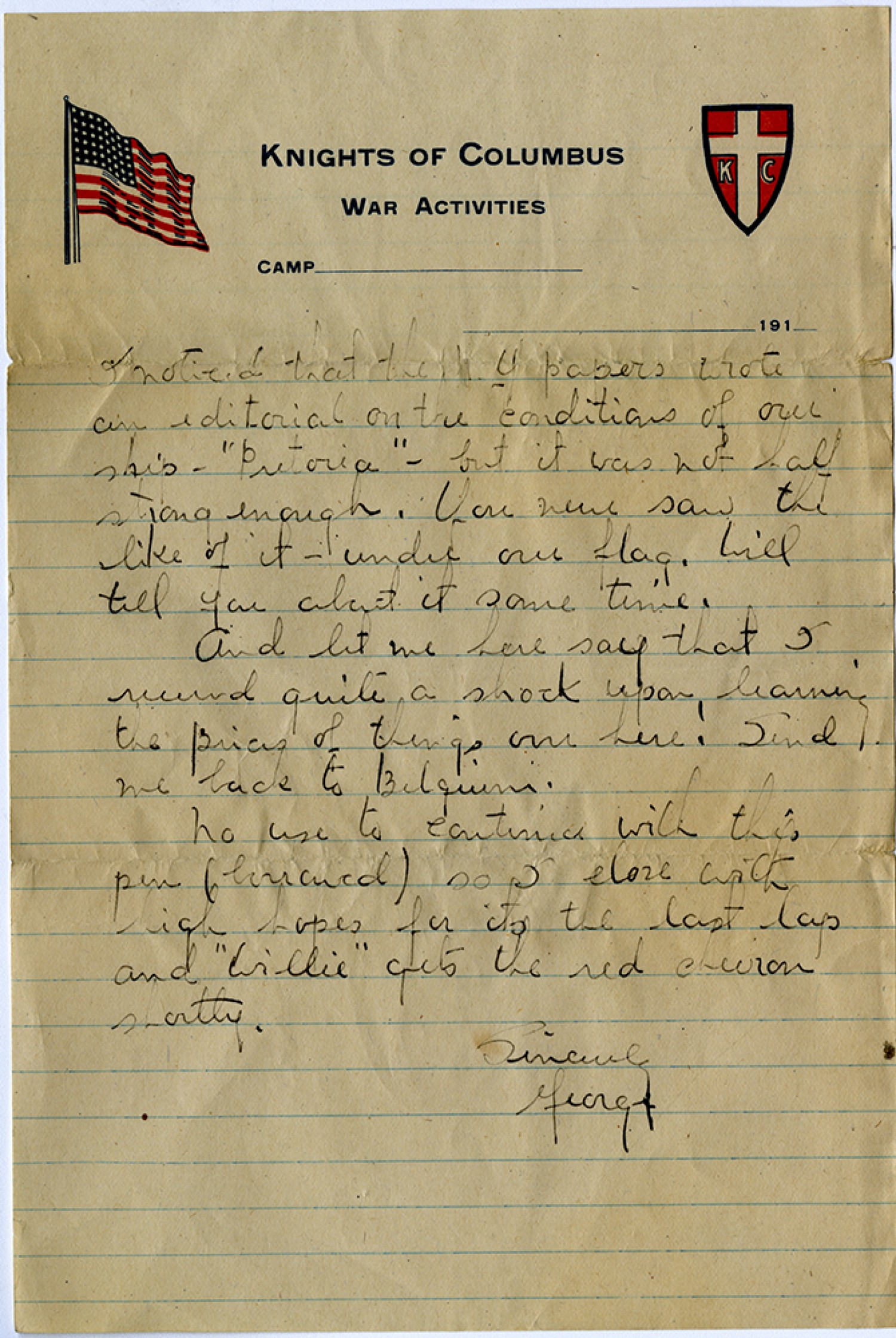 [page 4] I noticed that the [Y.M.C.A.] papers wrote an editorial on the conditions of our ship – “Pretoria” – but it was not half strong enough. You never saw the like of it – under our flag. Will tell you about it some time. And let me here say that I received quite a shock upon learning the prices of things over here! Send me back to Belgium. No use to continue with this pen (borrowed) so I close with high hopes for its the last lap and “Willie” gets the red chevron shortly. Sincerely George