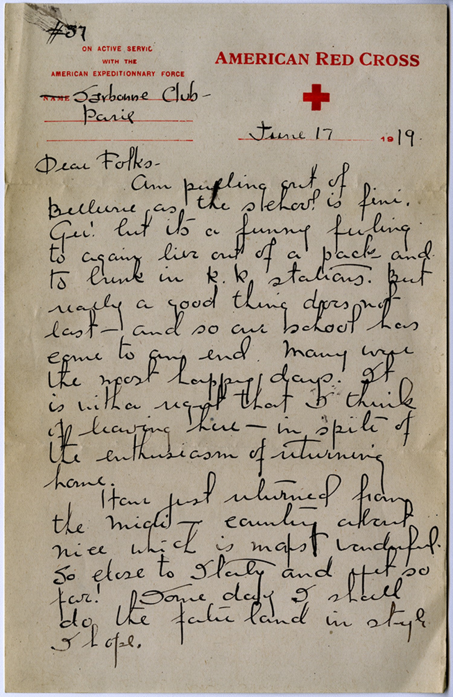#87 Sarbonne Club Parie June 17 1919 Dear Folks – Am pulling out of Bellevue as the school is fini, ger! but its a funny feeling to again live out of a pack and to bunk in R.R. stations. But really a good thing does not last – and so our school has come to an end. Many were the most happy days. It is with a regret that I think of leaving here – in spite of the enthusiasm of returning home. Have just returned from the midi – country about Nice which is most wonderful. So close to Italy and yet so far! Some day I shall do the faterland in style I hope.