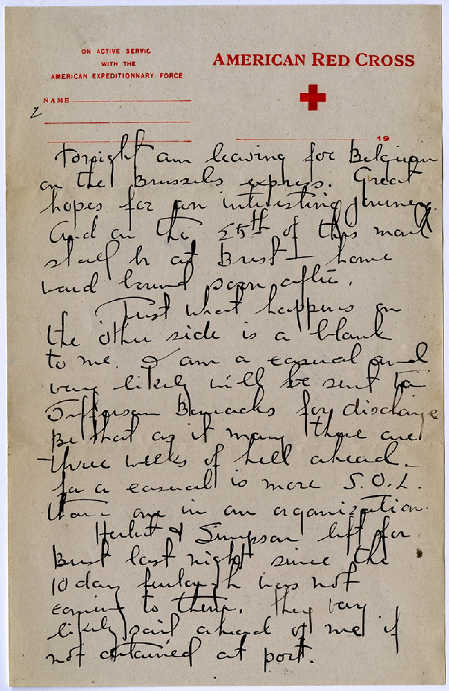 [page 2] Tonight am leaving for Belgium on the Brussels express. great hopes for an interesting journey. And on the 25th of this month should be at Brest – home ward bound soon after. Just what happens on the other side is a blank to me. I am a casual and very likely will be sent to Jefferson Barracks for discharge Be that as it may there are three weeks of hell ahead – for a casual is more S.O.L. than one in an organization. Herbert & Simpson left for Brest last night since the 10 day furlough was not coming to them. they very likely sail ahead of me if not detained at port.