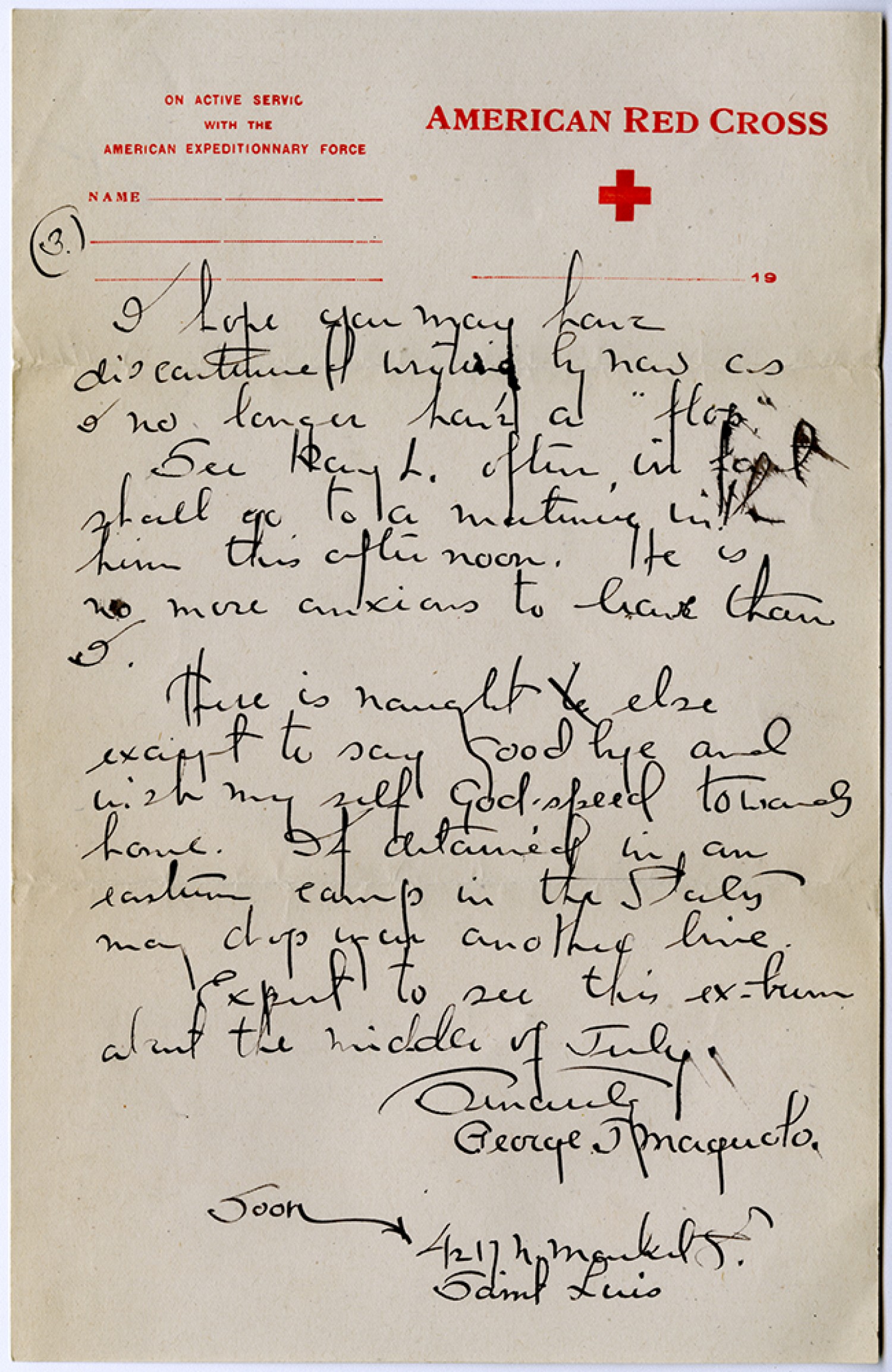 [page 3] I hope you may have discontinued writing by now as I no longer have a “flop”. See Ray L. often, in fact shall go to a matinee with him this afternoon. He is no more anxious to leave than I. there is naught else except to say goodbye and wish my self god speed towards home. If detained in an eastern camp in the States may drop you another line. Expect to see this ex-bum about the middle of July. Sincerely George J. Maguolo. Soon - 4217 N. Market St. [St. Louis]