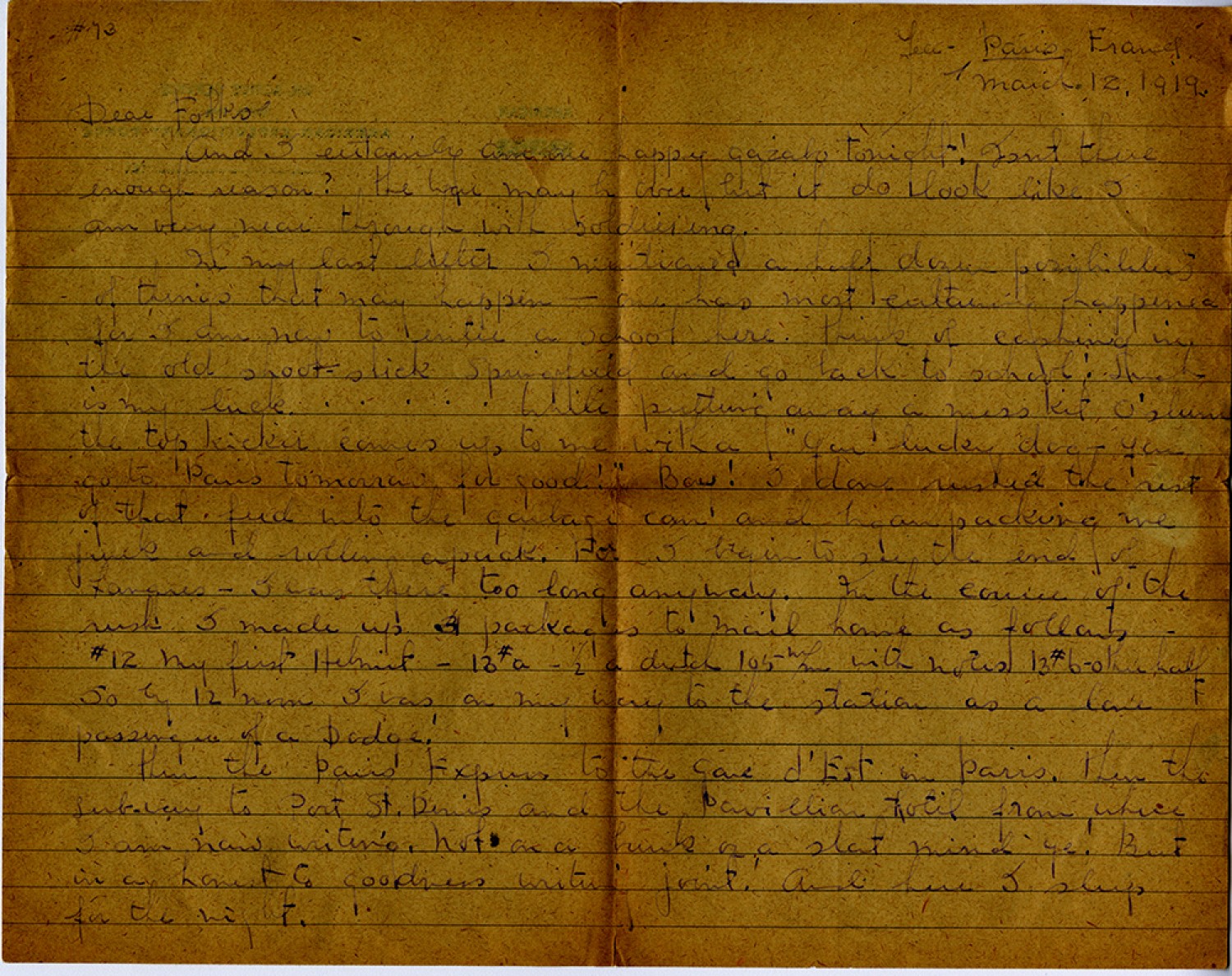 #73 Yea - Paris France March 12, 1919. Dear Folks And I certainly am one happy gazabo tonight! Isnt there enough reason? the War may be over but it do look like I am very near through with soldiering. In my last letter I mentioned a half dozen possibilities of things that may happen – one has most certainly happened for I am now to enter a school here. think of cashing in the old shoot-stick Springfield and go back to school! Such is my luck. . . . . While putting away a mess kit O’slum the top kicker comes up to me with a “you lucky dog – you go to Paris tomorrow for good! “ Boy! I done rushed the rest of that feed into the garbage can and began packing me junk and rolling a pack. For I begin to see the end of Langres – I was there too long anyway. In the course of the rush I made up 3 packages to mail home as follows #12 my first Helmit – 13# a ½ a dutch 105th m/m with notes 13# b – other half So by noon I was on my way to the station as a lone passenger of a Dodge! Then the Paris express to the gare d’ Est in Paris. then the subway to Port St. Denis and the Pavillion hotel from where I am now writing. Not on a bunk or a slat mind ye! But in a honest to goodness writing joint. And here I sleep for the night.