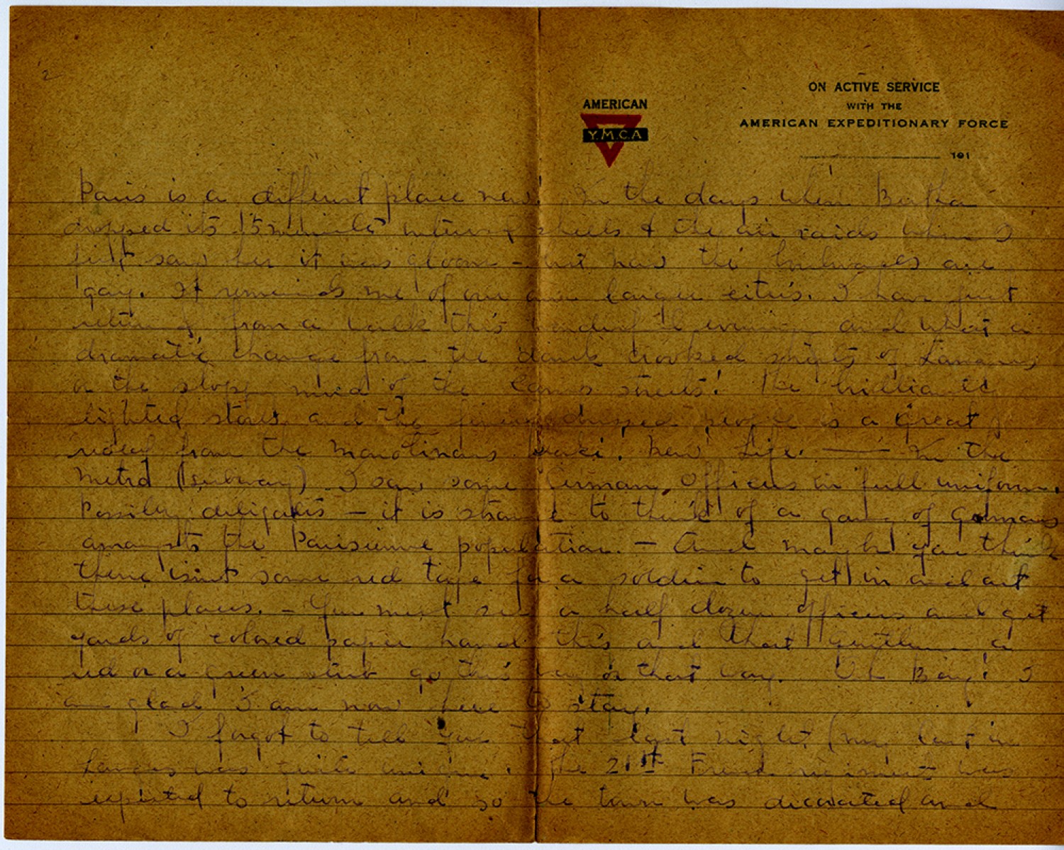 [page 2] Paris is a different place now! In the days when Bertha dropped its 15 minute interval shells & the air raids when I first saw her it was gloom – but now the boulevards are gay. It reminds me of our own larger cities. I have just returned from a walk this wonderful evening and what a dramatic change from the dark crooked streets of Langres or the slop mud of the camp streets! the brilliantly lighted stores and the finely dressed people is great relief from the montinous khaki! New Life - In the metro (subway) I saw some german Officers in full uniform. Possibly delegates – it is strange to think of a gang of germans amongst the Parisienne population – And maybe you think there isnt some red tape for a soldier to get in and out these places. – You must see a half dozen officers and get yards of colored paper hand this and that gentleman a red or green stub go this way or that way. Oh Boy! I am glad I am now here to stay. I forgot to tell you that last night (my last in Langres was quite unique. The 21st French regiment was expected to return and so the town was decorated and