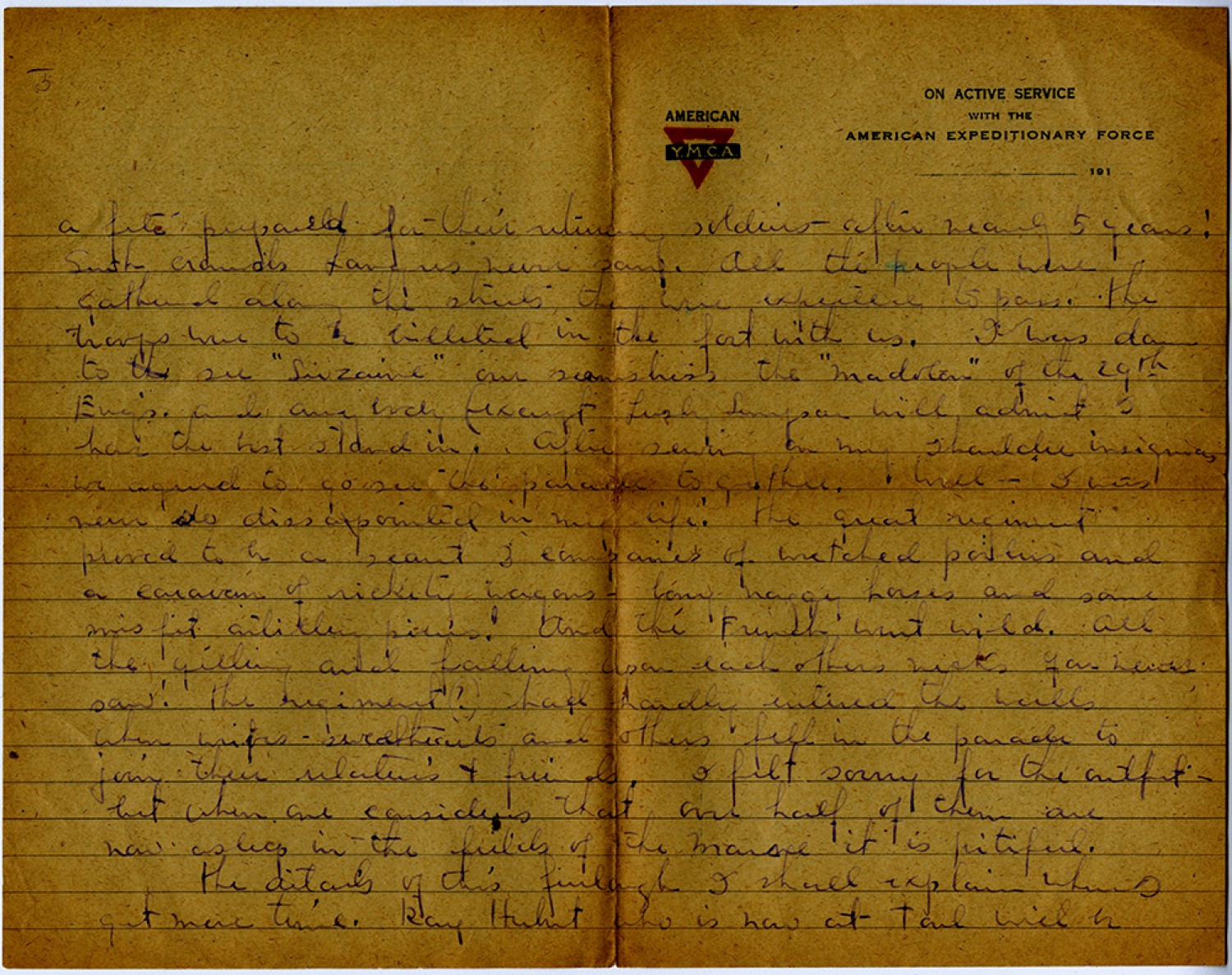 [page 3] a fite prepared for their returning soldiers - after nearly 5 years! Such crowds Langres never saw. All the people were gathered along the streets they were expected to pass. the troops were to be billeted in the fort with us. I was down to see “Suzaine” our seamstress the “madolen” of the 29th [Engineers] and anybody (except Lusly Simpson will admit I have the best stand in. After sewing on my shoulder insignias we agreed to go see the parade together. Well – I was never so disappointed in my life! the great regiment proved to be a scant 3 companies of wretched poilus and a caravan of rickety wagons – bony naggy horses and some misfit artillery pieces. And the French went wild. All the yelling and falling upon each others necks you never saw! the regiment (?) had hardly entered the walls when wives – sweethearts and others fell into the parade to join their relatives & friends. I felt sorry for the outfit – but when one considers that over half of them are now sleep in the fields of the Marne it is pitiful. the details of this furlough I shall explain when I get more time. Ray Herbert who is now at Toul will be