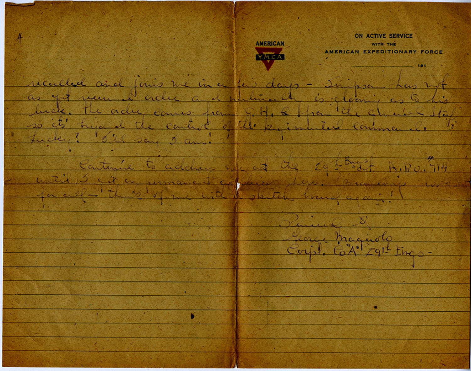 [page 4] recalled and joins me in a few days - Simpson had not as yet received order naturally is gloomy as to his luck. the order comes from [General Headquarters] from the general Staff so it’s beyond the control of the Regimental command. Lucky? I’ll say I am! Continue to address me at 29th [Engineers] at A.P.O. #714 until I get a permanent address here. Beaucoup love for all – think of me with sketch board again! Sincerely George Maguolo [Corporal] Co ”A” 29th [Engineers] -