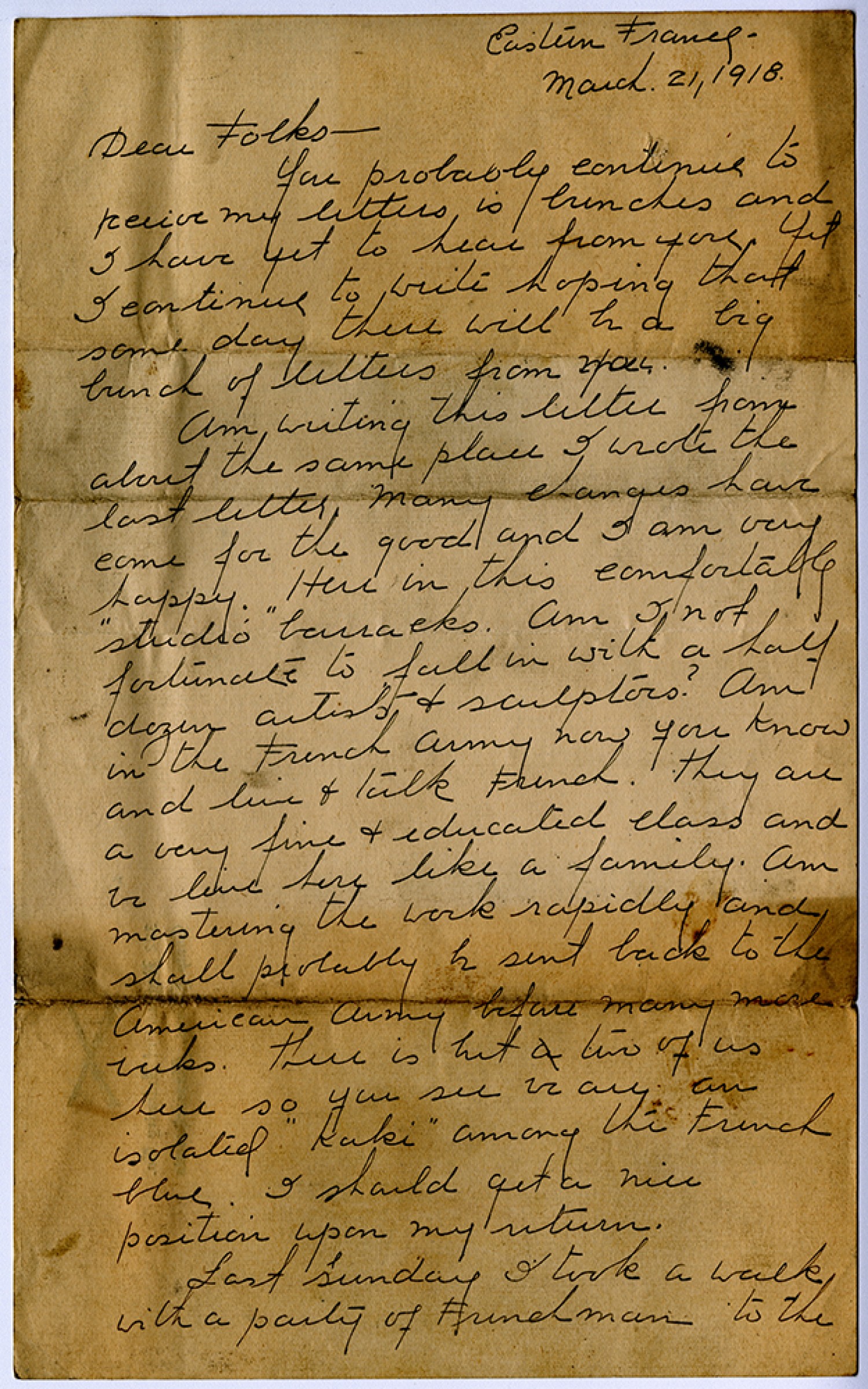 Eastern France March 21, 1918. Dear Folks – You probably continue to receive my letters in bunches and I have yet to hear from you. Yet I continue to write hoping that some day there will be a big bunch of letters from you. Am writing this letter from about the same place I wrote the last letter, many changes have come for the good and I am very happy. Here in the comfortable “studio” barracks. Am I not fortunate to fall in with a half dozen artists & sculptors? Am in the French Army now you know and live & talk French. They are a very fine & educated class and we live here like a family. Am mastering the work rapidly and shall probably be sent back to the American Army before many more weeks, There is but two of us here so you see we are an isolated “kaki” among the French blue. I should get a nice position upon my return. Last Sunday I took a walk with a party of Frenchman to the