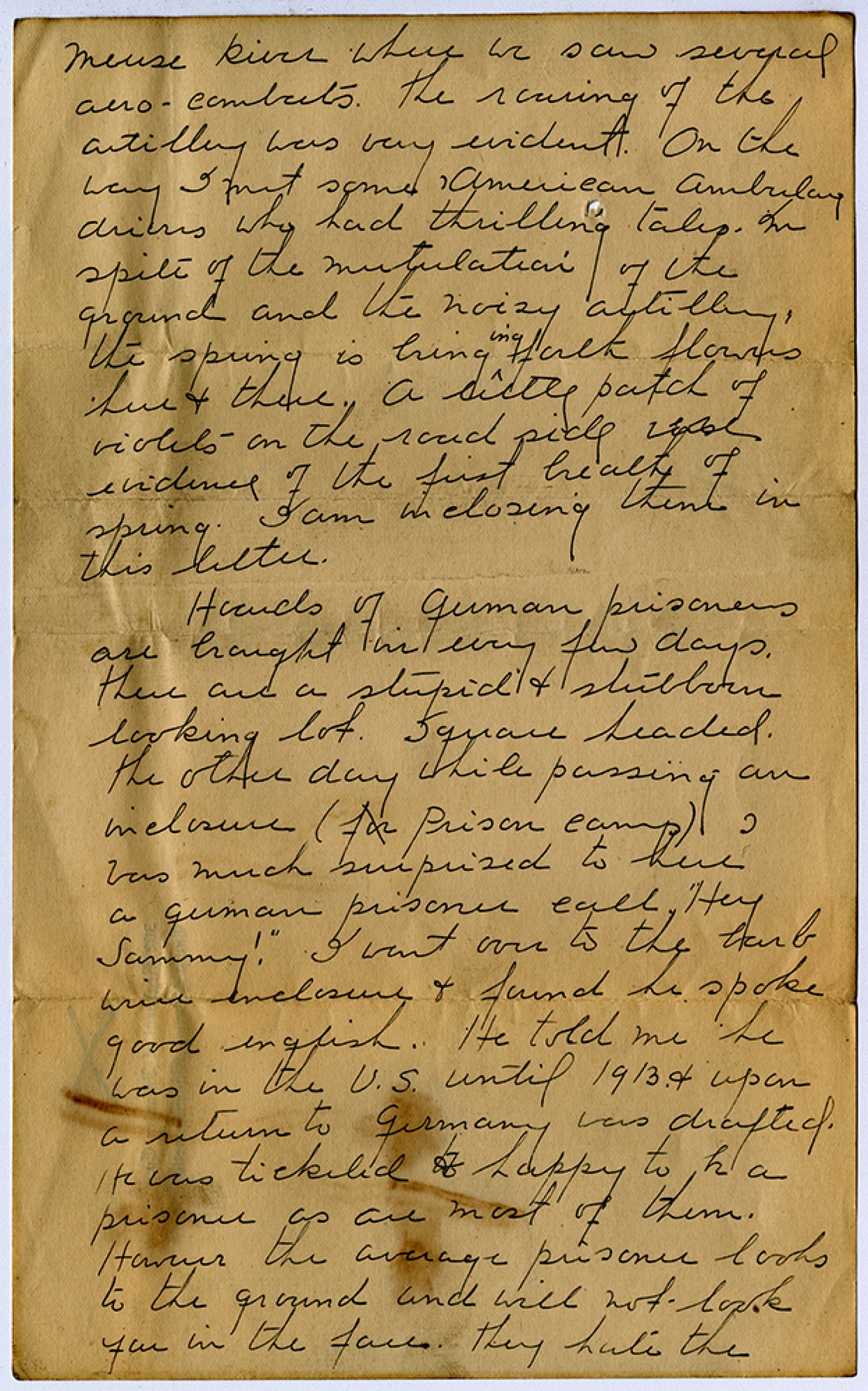 Meuse River where we saw several aero-combats. The roaring of the artillery was very evident. On the way I met some American Ambulance drivers who had thrilling tales. In spite of the mutilation of the ground and the noisy artillery, the spring is bringing forth flowers here & there. A little patch of violets on the road side [ms illegible: 1 wd] evidence of the first breath of spring. I am inclosing them in this letter. Hoards of German prisoners are brought in every few days. There are a stupid and stubborn looking lot. Square headed. The other day while passing an inclosure (Prison camp) I was much surprised to here a german prisoner call “Hey Sammy!” I went over to the barb wire enclosure & found he spoke good english. He told me he was in the U.S. until 1913 & upon a return to germany was drafted. He was tickeled & happy to be a prisoner as are most of them. However the average prisoner looks to the ground and will not look you in the face. They hate the