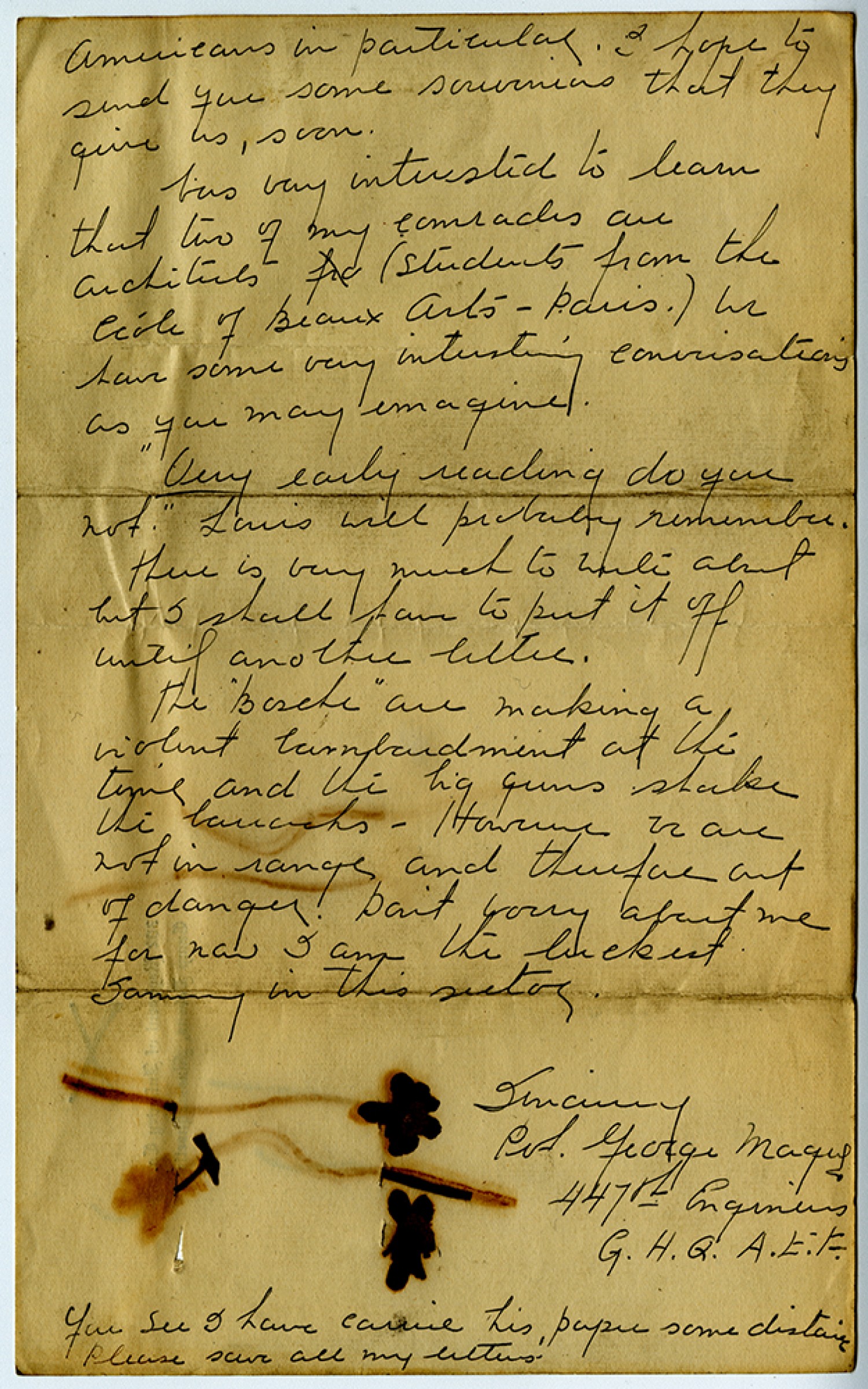 Americans in particluar. I hope to send you some souvenirs that they give us, soon. Was very interested to learn that two of my comrades are architects (students from the Ciole of Beaux Arts – Paris) We have some very interesting conversations as you may imagine. “Very early reading do you not.” Louis will probably remember. There is very much to write about but I shall have to put it off until another letter. The “Bosche” are making a violent bombardment at the time and the big guns shake the barracks – However we are not in range and therefore out of danger. Don’t worry about me for now I am the luckiest Sammy in the sector. [flowers glued to the page] Sincerely [Private] George Maguolo 447th Engineers [General Headquarters] A. E.F. You see I have carried this paper some distance. Please save all my letters.