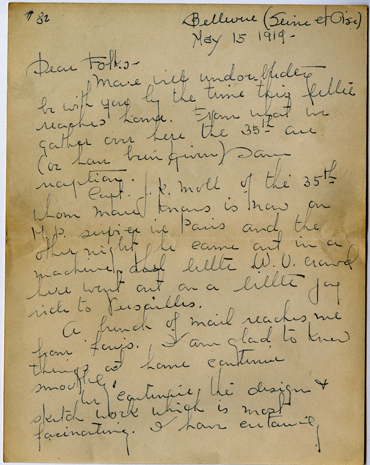 #82 Bellevue (Seine et Oise) May 15, 1919 – Dear Folks – Mare will undoubtedly be with you by the time this letter reaches home. From what we gather over here the 35th are (or have been given) same reception. Capt. J. K. Moll of the 35th whom Mare knows is now an MP superior in Paris and the other night he came out in a machine and little [Washington University] crowd here went out on a little joy ride to Versailles. A bunch of mail reaches me from Louis. I am glad to know things at home continue smoothly. We continue the design & sketch work which is most fascinating. I have certainly