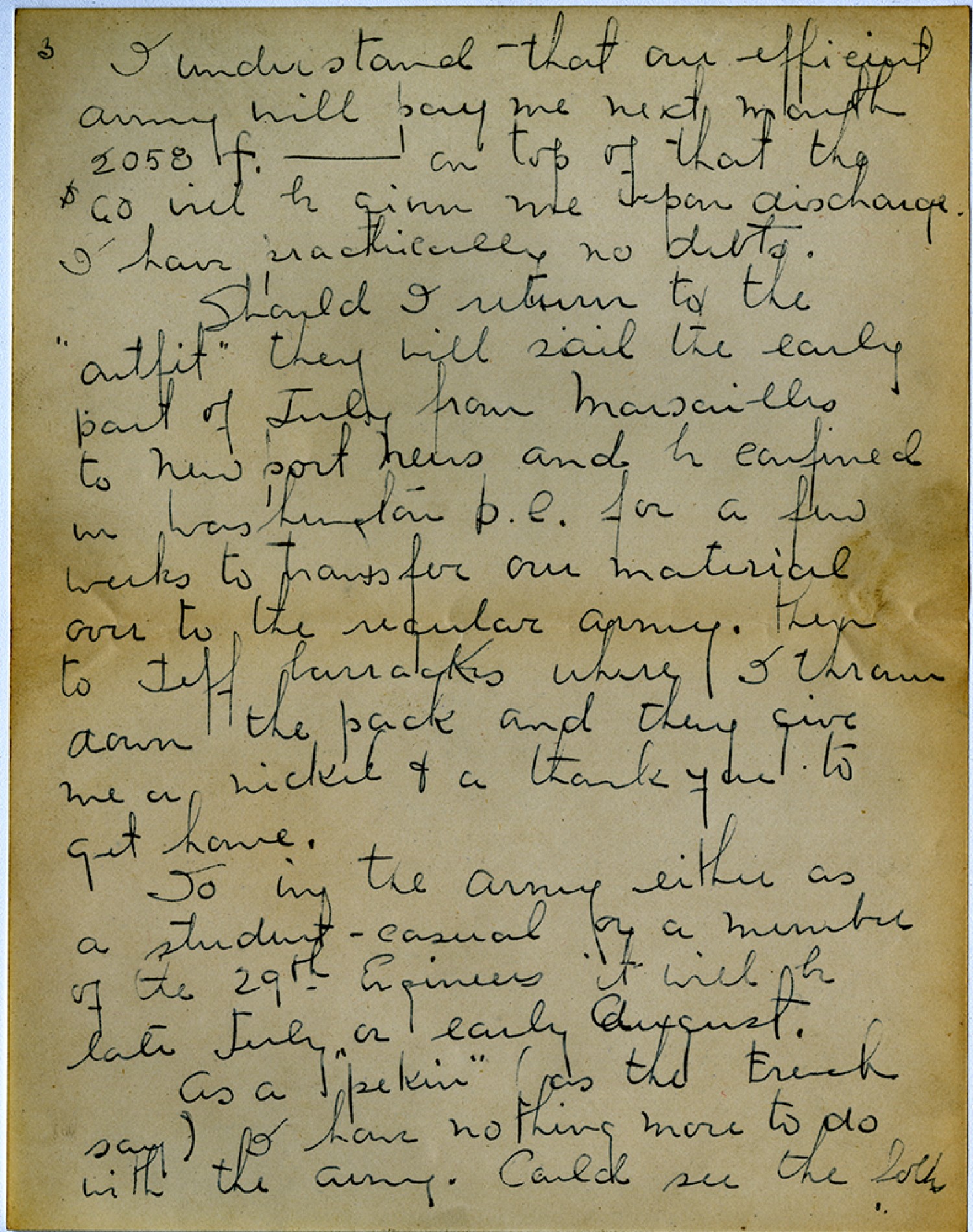 [page3] I understand that our efficient army will pay me next month 2058 [francs] - on top of that the $60 will be given me upon discharge. I have practically no debts. Should I return to the “outfit” they will sail the early part of July from Marseilles to Newport News and be confined in Washington D.C. for a few weeks to transfer our material over to the regular Army. then to [Jefferson] barracks where I throw down the pack and they give me a ticket & a thank you to get home. So in the army either as a student-casual or a member of the 29th Engineers it will be late July or early August. As a “pekin” (as the French say) I have nothing more to do with the army. Could see the folks