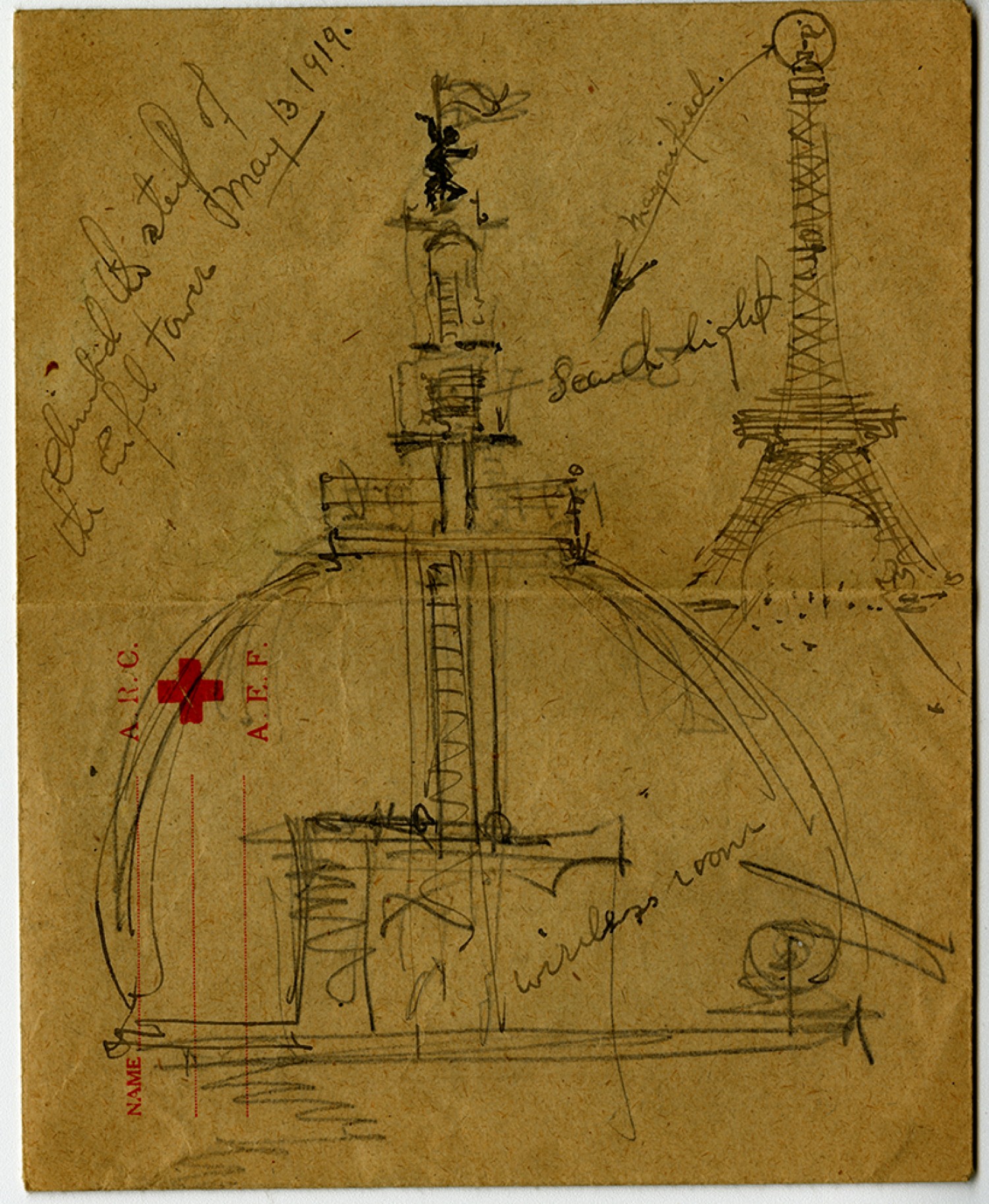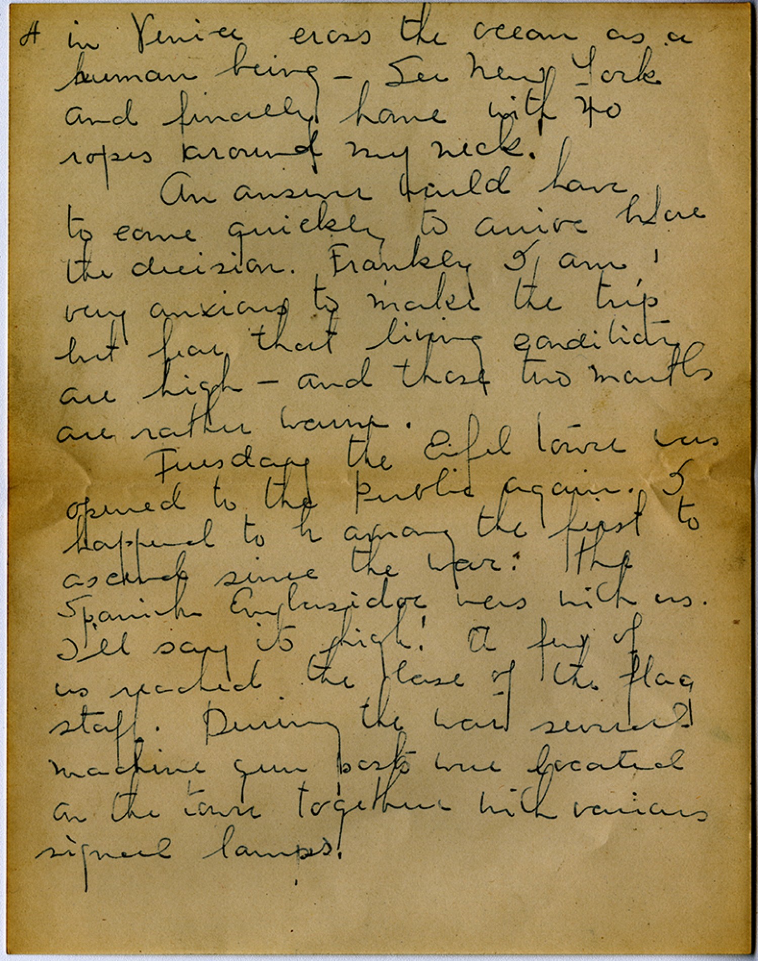 [page 4] in Venice cross the ocean as a human being – See New York and finally home with 40 ropes around my neck. An answer would have to come quickly to arrive before the decision. Frankly I am very anxious to make the trip but fear that living conditions are high – and those two months are rather warm. Tuesday the [Eiffel] tower was opened to the public again. I happened to be among the first to ascend since the war. the Spanish [Ambassador] was with us. I’ll say its high! A few of us reached the base of the flag staff. During the war several machine gun ports were located on the tower together with various signal lamps.
