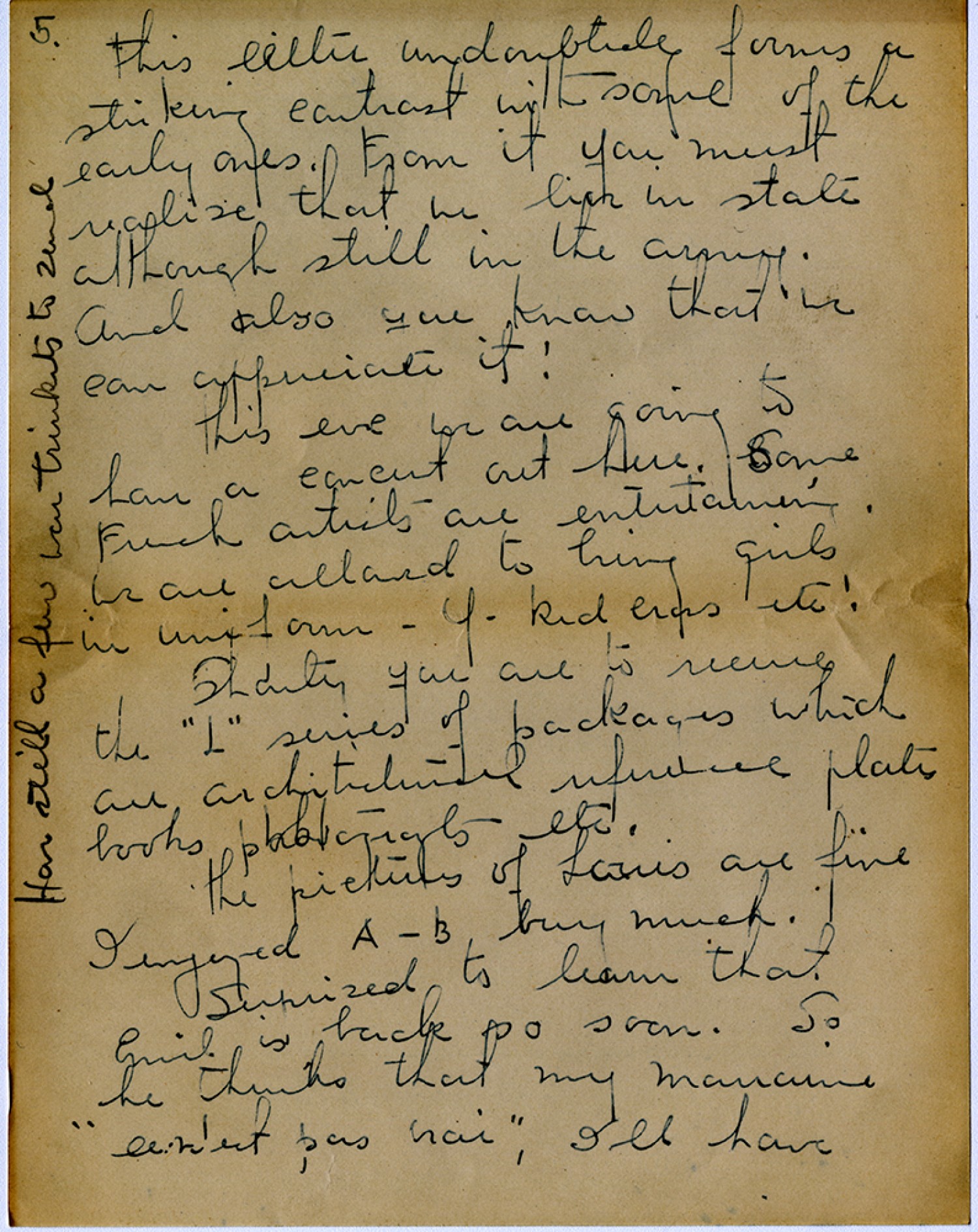 [page 5] this letter undoubtedly forms a striking contrast with some of the early ones. From it you must realize that we live in state although still in the army. And also you know that we can appreciate it! this eve we are going to have a concert out here. Some French artists are entertainer. We are allowed to bring girls in uniform – [Y. M.C. A.] –Red Cross etc! Shortly you are to receive the “L” series of packages which are architectural reference plates books photographs - etc. the pictures of Louis are fine I enjoyed A-B buy much. Surprised to learn that Emil is back so soon. So he thinks that my Marraine “le n’est pas nai”, I’ll have [written in the margin] Have still a few trinkets to send