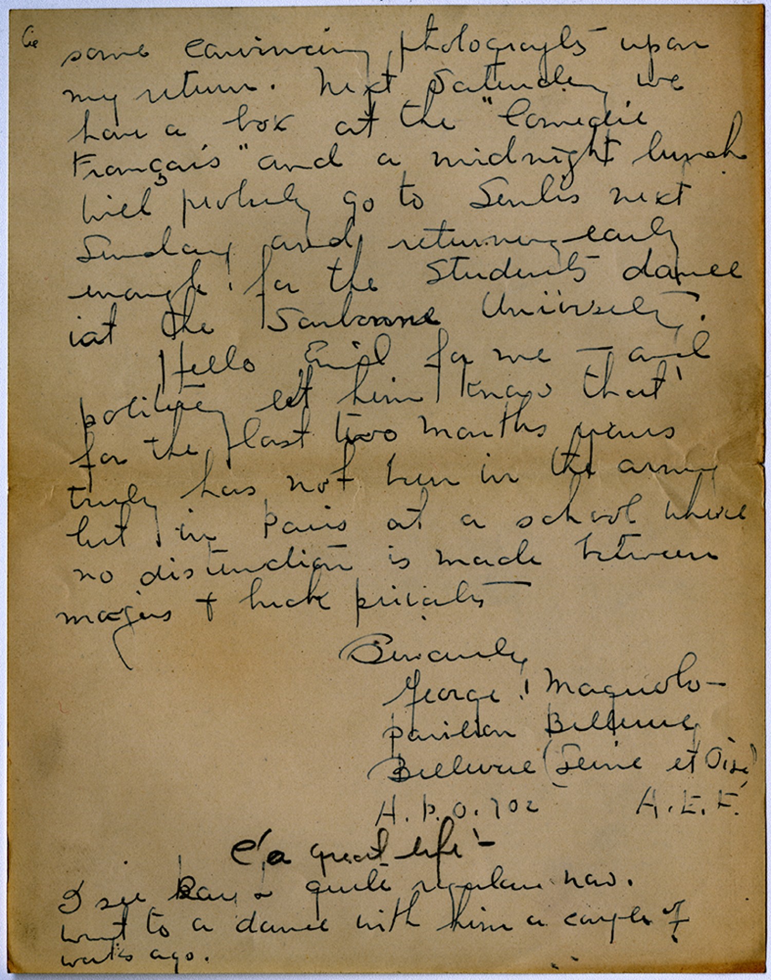 [page 6] some convincing photographs – upon my return. Next saturday we have a box at the “Comedie Fromgais” and a midnight lunch. Will probably go to Senlis next Sunday and return early enough for the Students dance at the Sorbonne University. Hello Emil for me – and politely let him know that for the last two months yours truly has not been in the Army but in Paris at a school where no distinction is made between majors & buck privates Sincerely, George Maguolo Pavilion Bellevue Bellevue (Seine et Oise) A.P.O. 702 A.E.F. C’a quest life – I see Ray L quite regular now. Went to a dance with him a couple weeks ago.