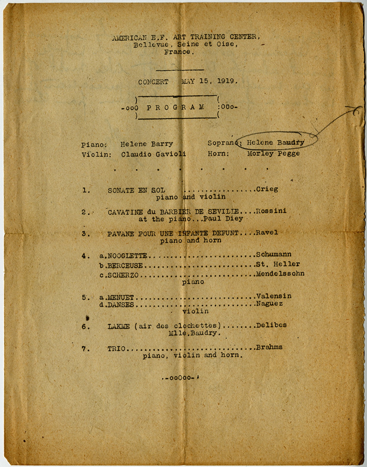 American E.F. ART TRAINING CENTER, Bellevue, Seine et Oise, France. CONCERT MAY 15, 1919. Program Piano: Helene Barry Soprano: Helene Baudry Violin: Claudio Gavioli Horn: Morley Pegge 1. SONATE EN SOL . . . Crieg piano and violin 2. CAVATINE du BARBIER DE SEVILLE . . . Rossini at the piano ... Paul Diey 3. PAVANE POUR UNE INFANTE DEFUNT . . . Ravel piano and horn 4. a. NOOGLETTE . . . Schumann b. BERCEUSE . . . St. Heller c. SCHERZO . . . Mendelssohn piano 5. a. MENUET . . . Valensin d. DANSES . . . Naguez violin 6. LAKME (air des clochettes). . . Delibes Mlle. Baudry. 7. TRIO . . . Brahms piano, violin and horn.