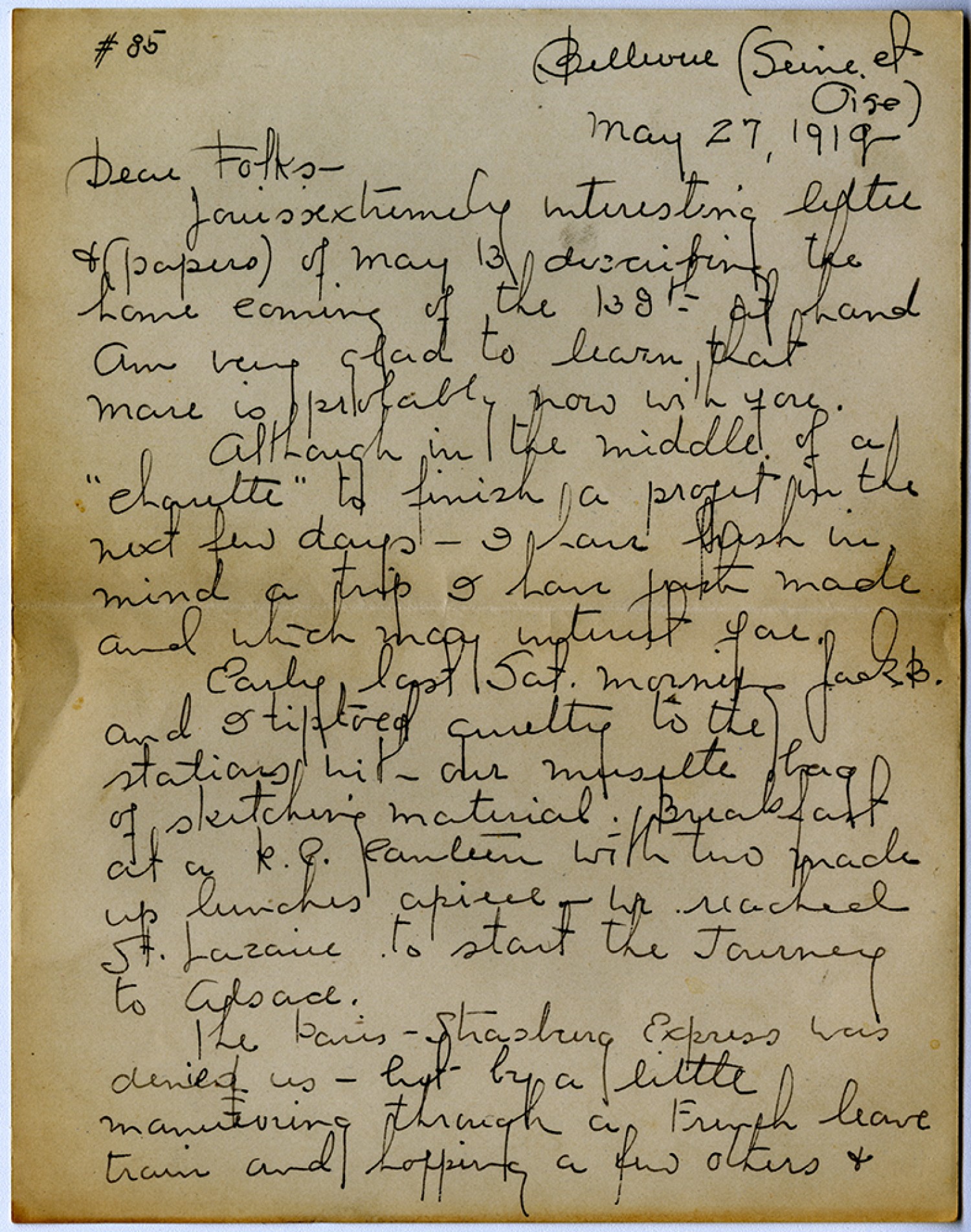 #85 Bellevue (Seine et Oise) May 27, 1919 Dear Folks – Louis’s extremely interesting letter & (papers) of May 13 describing the home coming of the 138th at hand Am very glad to learn that Mare is probably now with you. Although in the middle of ”chautte” to finish a project in the next few days – I have fresh in mind a trip I have just made and which may interest you. Early last [Satuday] morning Jack B. and I tiptoed quietly to the station with our musette bag of sketching material. Breakfast at the [Red Cross] Canteen with two made up lunches a piece – we reached St. Lazaire to start the Journey to Alsace. The Paris –Strasburg Express was denied us – but by a little maneuvering through a French leave train and hopping a few others &