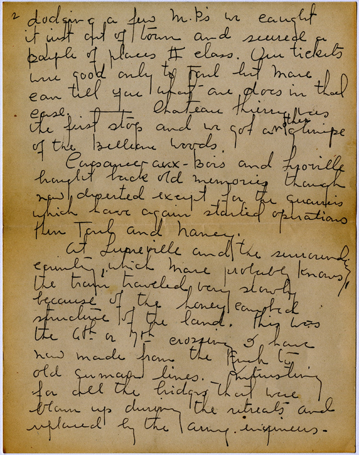 [page 2] dodging a few M.P’s we caught it just out of town and secured a couple of places II class. Our tickets were good only to Toul but Mare can tell you what one does in that case. - Chateau Thierry was the first stop and we got another glimpse of the Belleau Woods. Consaree-aux –Bois and Luoville brought back old memories though now deserted except for the quarries which have again started operations then Toul and Nancy. At Lupreville and the surrounding country, which Mare probably knows, the train traveled very slowly because of the honey combed structure of the land. this was the 6th or 7th crossing I have now made from the French to old german lines. - Interesting for all the bridges that were blown up during the retreats and replaced by the army engineers.