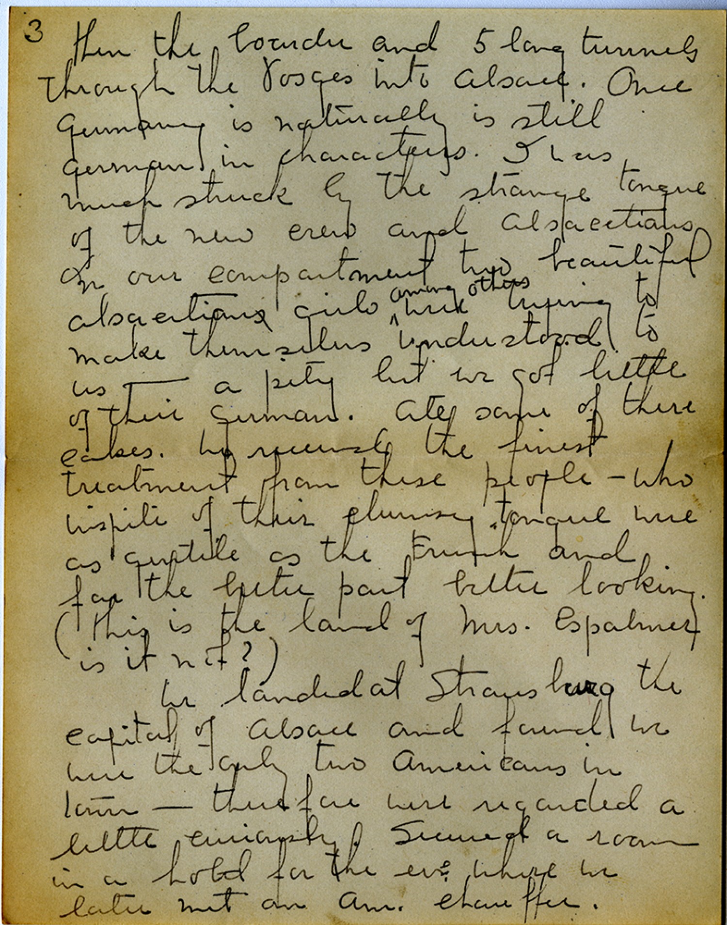 [page 3] then the boarder and 5 long tunnels through the Vosges into Alsace. Once germany is naturally is still german in characters. I was much struck by the strange tongue of the new crew and Alsacetians In our compartment two beautiful alsacetians girls among others were trying to make themselves understood to us - a pity but we got little of their german. Ate some of their cakes. We received the finest treatment from these people – who inspite of this clumsy tongue were as gentile as the French and for the better part better looking. (this is the land of Mrs. Cspalmer it it not?) We landed at Strasburg the capital of Alsace and found we were the only two Americans in town – therefore were regarded a little curiously. Secured a room in a hotel for the eve where we later met on [American] chauffer.
