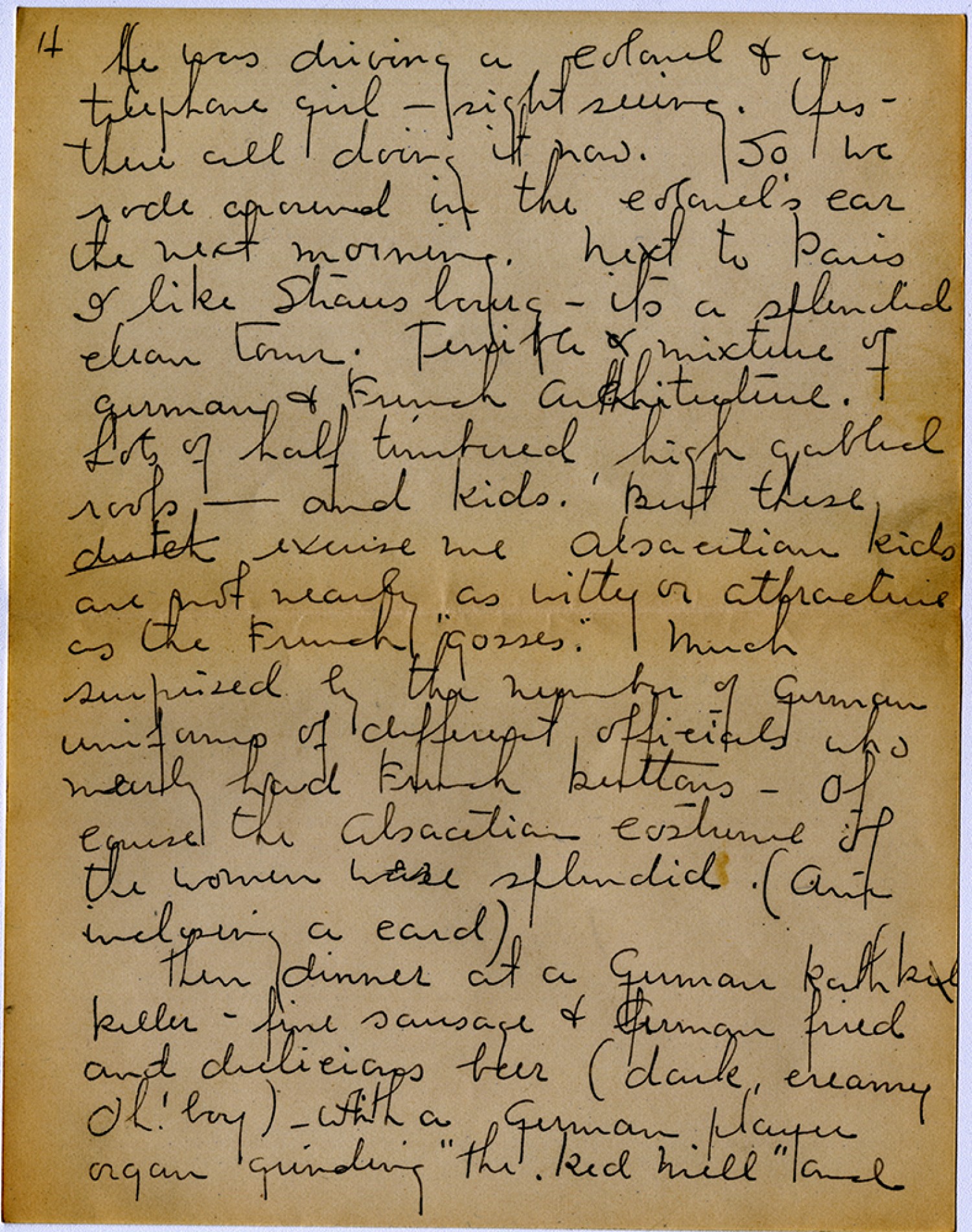 [page 4] He was driving a colonel & a telephone girl – sight seeing. Yes - there all doing it now . So we rode around in the Colonel’s car the next morning. Next to Paris I like Strausburg – its a splendid clean town. Terrible mixture of german & French architecture. Lots of half timbered, high gabled roofs – and kids. But these excuse me alsacetian kids are not nearly as witty or attractive as the French “gosses.” Much surprised by the number of german uniforms of different officials who nearly had French buttons – of course the alsacetian costume of the women was splendid. (am inclosing a card) then dinner at a german Ruthkul killer – fine sausage & german fried and delicious beer (dark, creamy Oh! boy) – with a german player organ grinding “The Red mill“ and