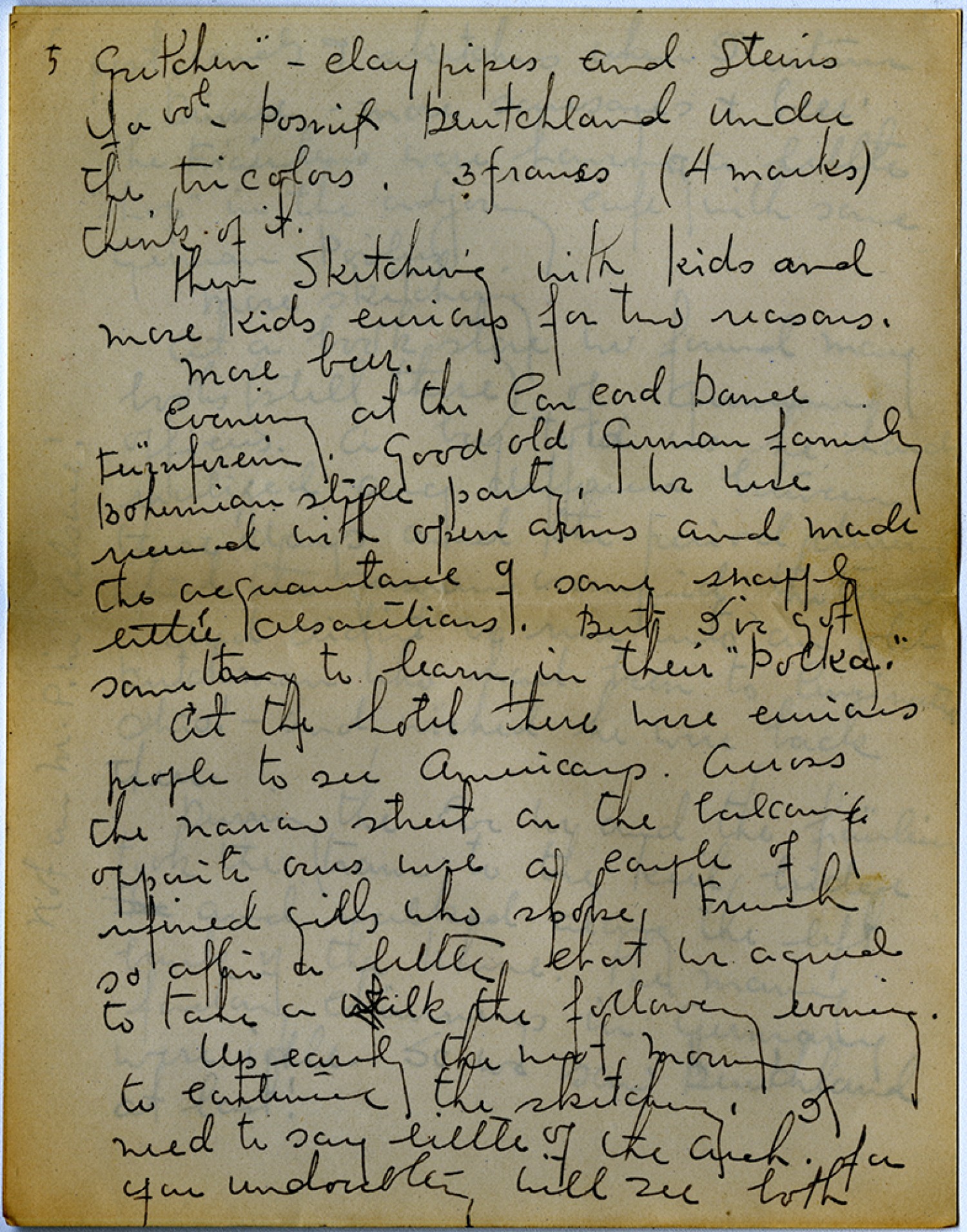 [page 5] gretchen” – clay pipes and Steins Yavol – posrit Deutchland under the tricolors. 3 francs (4 marks) think of it. then sketching with kids and more kids curious for two reasons. More beer. Evening at the Con cord Dance Turnfirein. good old german family Bohemian stiple party. We were received with open arms and made the acquintance of some shaffle little alsacetians. But I’ve got something to learn in their “Polka.” At the hotel there were curious people to see Americans. Across the narrow street on the balcony opposite ours were a couple of refined girls who spoke French so after a little chat we agreed to take a walk the following evening. Up early the next morning to continue the sketching. I need to say little of the [Architecture] for you undoubtedly will zee both