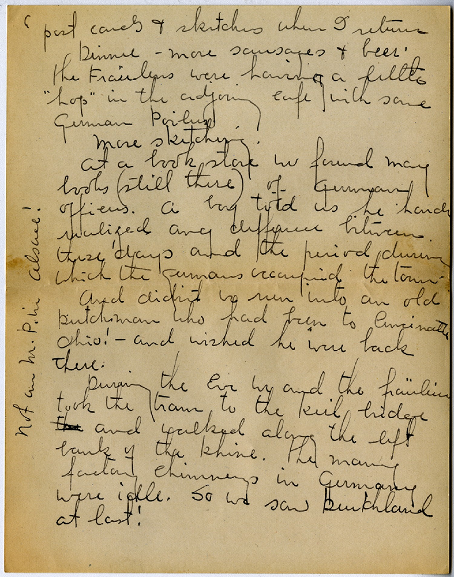 [page 6] post cards & sketches when I return Dinner – more sausages & beer. the Fraulines were having a little “hop” in the adjoining cafe with some german Poilus. More sketching. At a book store we found many books (still there) of german officers. A boy told us he hardly realized any difference between these days and the period during which the germans occupied the town. And didn’t we run into an old Dutchman who had been to Cincinatti Ohio! – and wished he were back there. During the Eve we and the frauline took the train to the keil brider and walked along the left bank of the Rhine. the many factory chimneys in germany were idle. So we saw Duetchland at last! [written in margin] not an M.P. in Alsace!