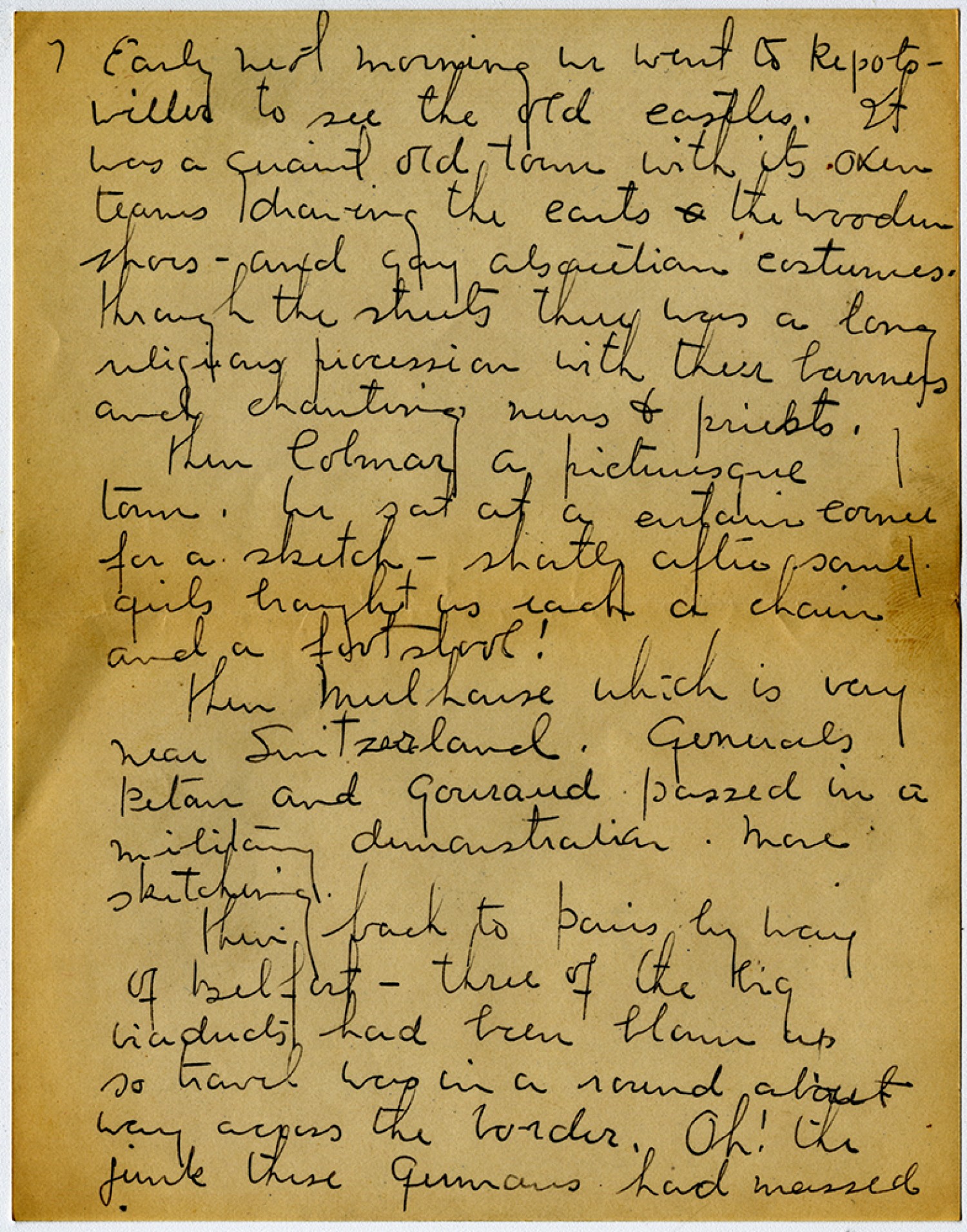 [page 7] Early next morning we went to Repots – miller to see the old castles. It was a quaint old town with its Oxen teams drawing the carts the wooden shoes – and gay alsacetian costumes. through the streets there was a long religious procession with their banners and chanting nuns & priests. then Colmar a picturesque town. We sat at a certain corner for a sketch – shortly after some girls brought us each a chain and a foot stool! then Mulhouse which is very near Switzerland. generals [Philippe] Petan and [Henri] gouraud passed in a military demonstration. More sketching. then back to Paris by way of Belfort – three of the big viaducts had been blown up so travel was in a round bout way across the border. Oh! the junk these germans had massed