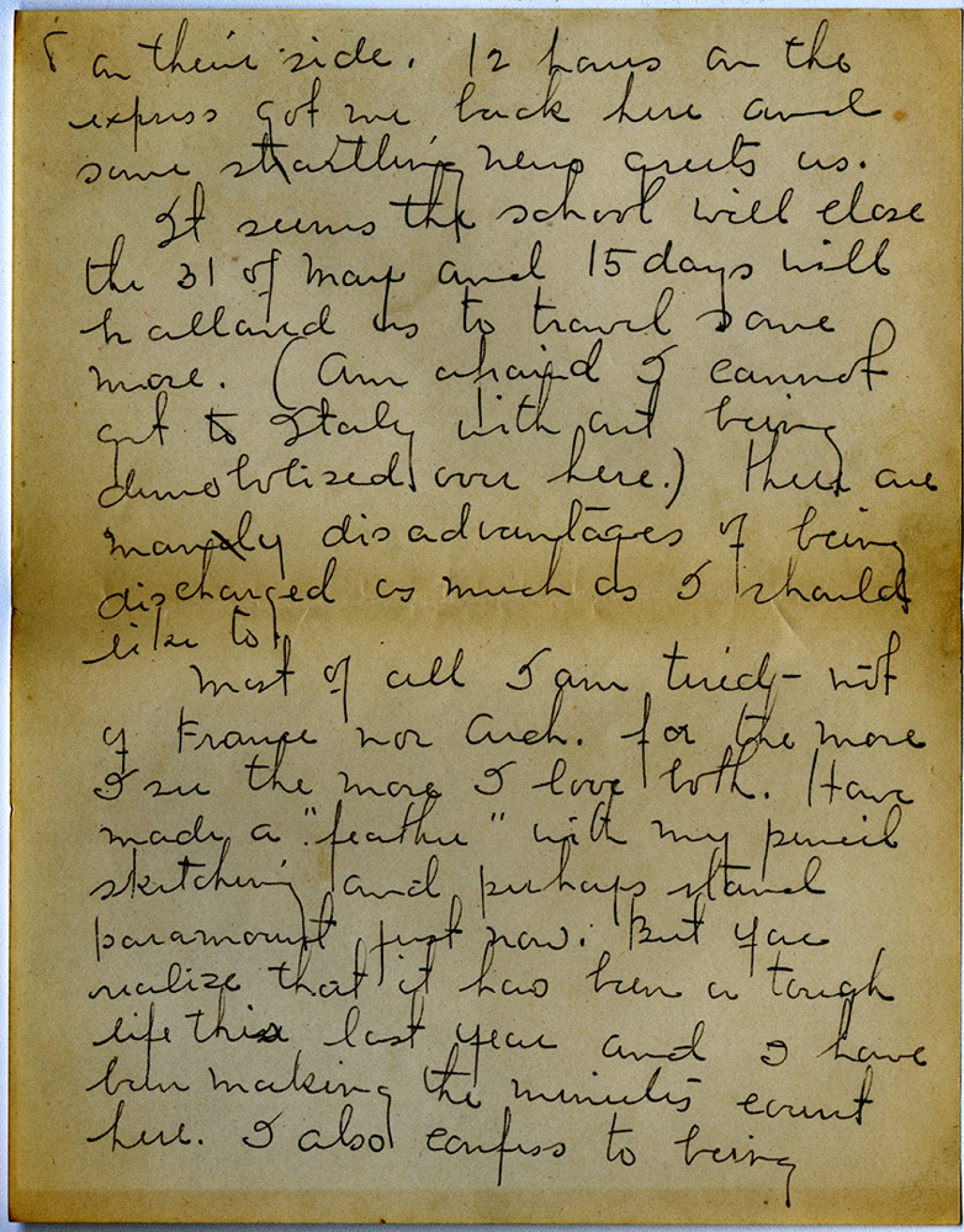 [page 8] on their side, 12 hours in the express got me back here and some startling news greets us. It seems that school will close the 31 of May and 15 days will be allowed as to travel some more. (Am afraid I cannot get to Italy without being demobilized over here.) there are many disadvantages of being discharged as much as I should like to. Most of all I am tired – not of France nor [Architecture]. for the more I see the more I love both. Have made a “feather” with my pencil sketching and perhaps stand paramount just now. But you realize that it has been tough life this last year and I have been making the minutes count here. I also confess to being