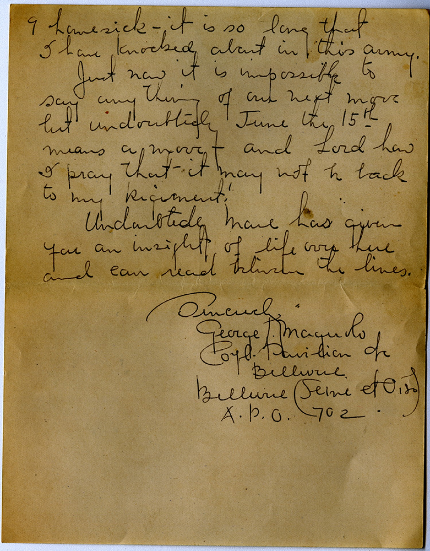 [page 9] homesick – it is so long that I have knocked about in this army. Just now it is impossible to say anything of our next move but undoubtedly June the 15th means a move – and Lord how I pray that it may not be back to my Regiment! Undoubtedly Mare has given you an insight of life over here and can read between the lines. Sincerely George Maguolo [Corporal] Pavilion of Bellevue Bellevue (Seine et Oise) A.P.O. 702