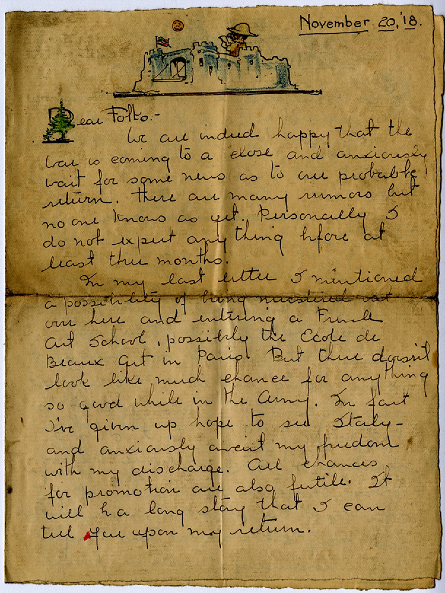 November 20, [1918] [sketch of fort] Dear Folks - We are indeed happy that the war is coming to a close and anxiously wait for some news as to our probable return. There are many rumors but no one knows as yet. Personally I do not expect anything before at least three months. In my last letter I mentioned a possibility of being mustered out over here and entering a French Art school, possibly the Ecole de Beaux art in Paris. But there doesn’t look like much chance for anything so good while in the Army. In fact I’ve given up hope to see Italy – and anxiously await my freedom with my discharge. All chances for promotion are also futile. It will be a long story that I can tell you upon my return.