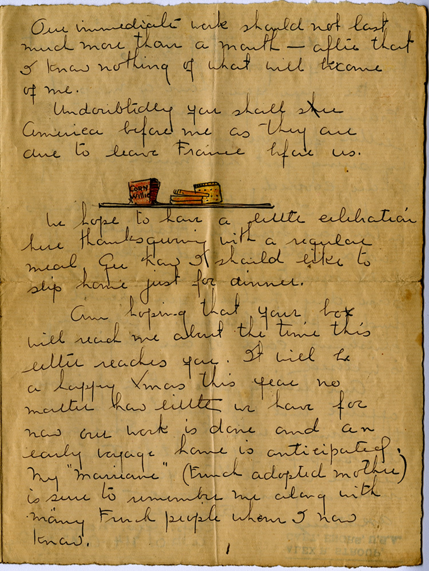Our immediate work should not last much more than a month – after that I know nothing of what will become of me. Undoubtedly you shall see America before me as they are due to leave France before us. [sketch of rations] We hope to have a little celebration here thanksgiving with a regular meal. gee how I should like to slip home just for dinner. Am hoping that your box will reach me about the time this letter reaches you. It will be a happy Xmas this year no matter how little we have for now our work is done and an early voyage home is anticipated. My “Marriane” (French adopted Mother) is sure to remember me along with many French people whom I now know.