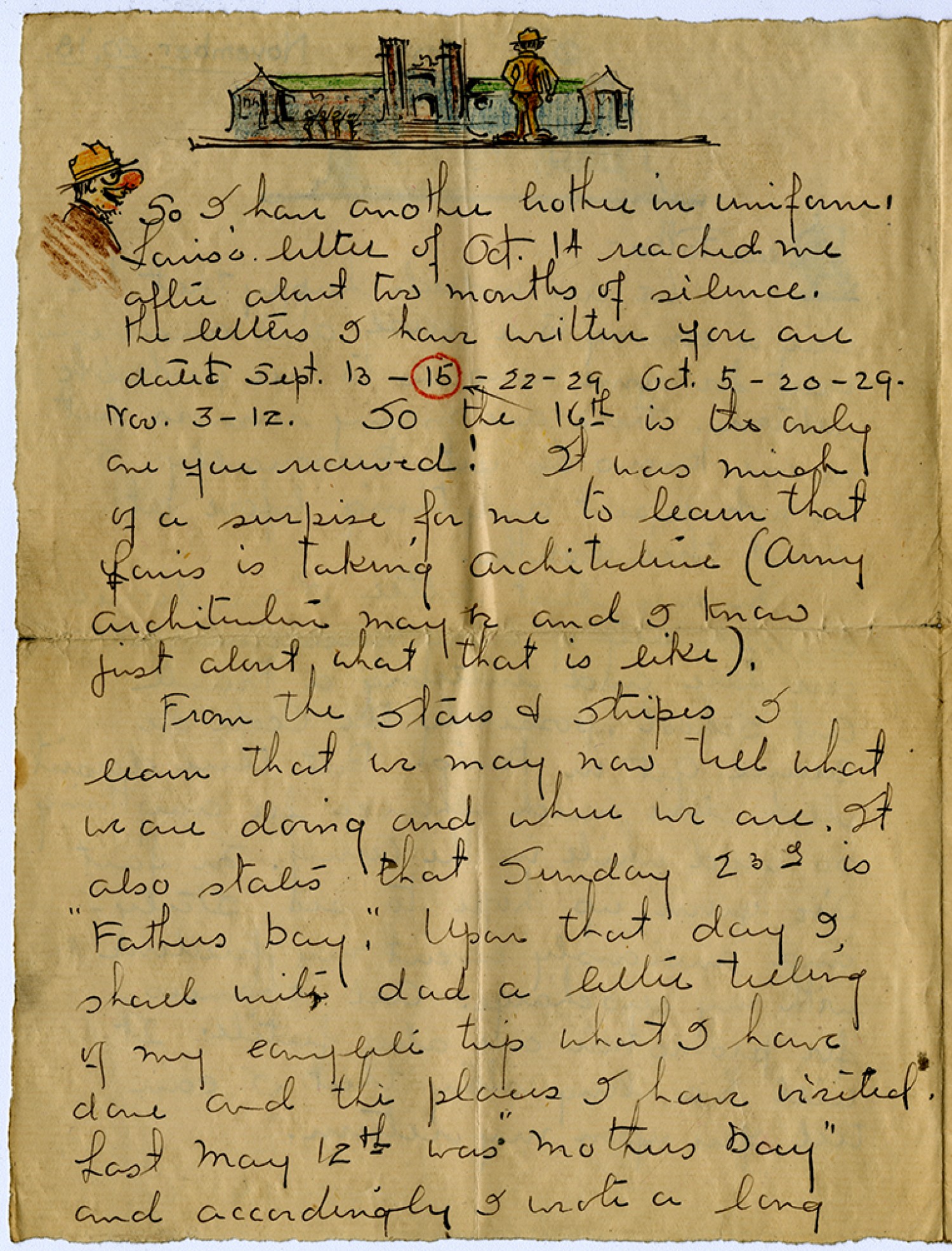[sketch of building] So I have another brother in uniform! Louis’s letter of [October] 14 reached me after about two months of silence. The letters I have written you are dated [September] 13 – 15 - 22 - 29 [October] 5 - 20 - 29. [November] 3-12. So the 16th is the only one you received! It was much of a surprise for me to hear that Louis is taking Architecture (Army Architecture may be and I know just about what that is like). From the Stars & Stripes I learn that we may now tell what we are doing and where we are. It also states that Sunday 23rd is “Fathers Day.” Upon that day I shall write dad a letter telling of my complete trip what I have done and the places I have visited. Last May 12th was “Mothers Day” and accordingly I wrote a long