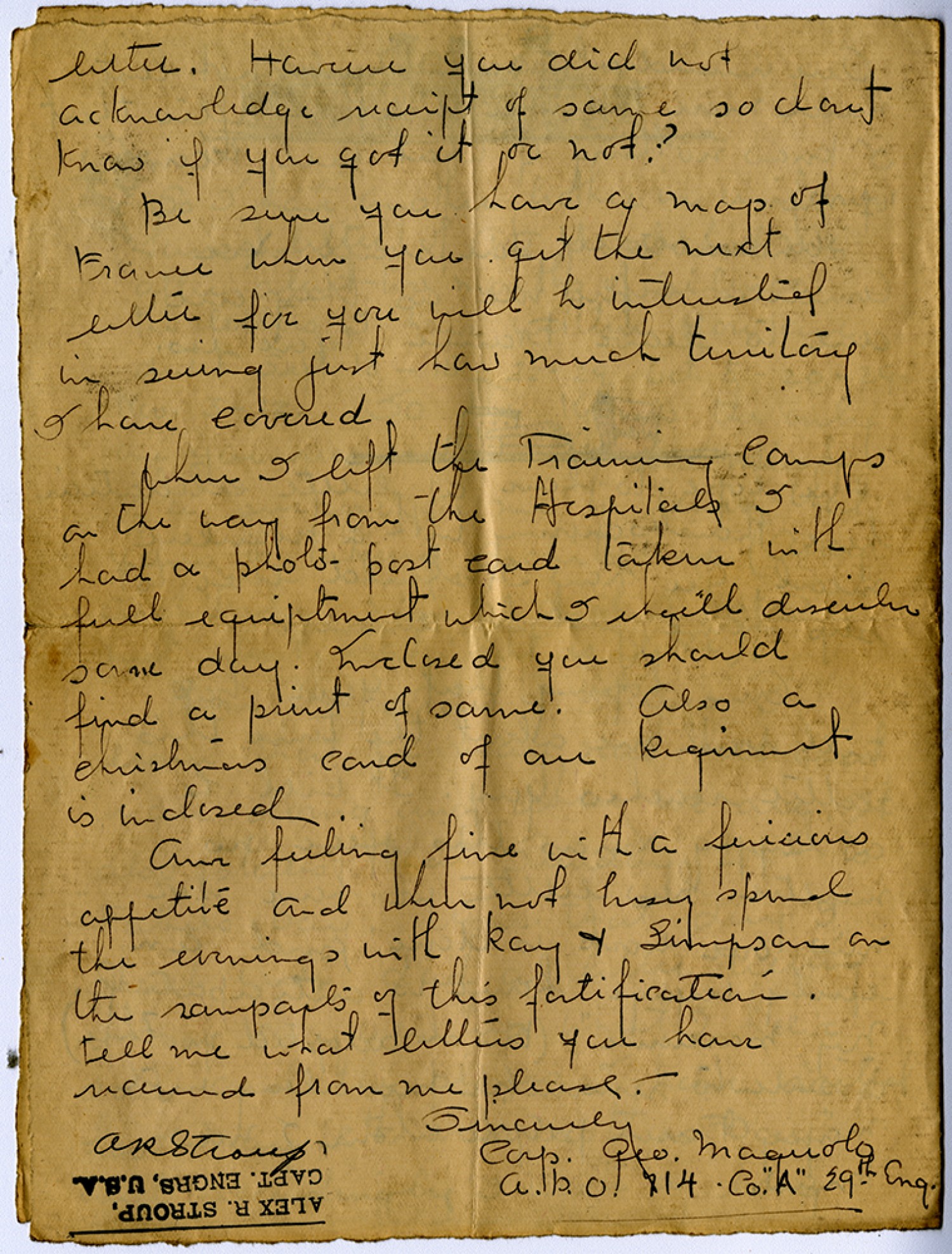 letter. However you did not acknowledge receipt of same so dont know if you got it or not? Be sure you have a map of France when you get the next letter for you will be interested in seeing just how much territory I have covered. When I left the Training Camps on the way from the Hospitals I had a photo - post card taken with full equipment which I will describe some day. Inclosed you should find a print of same. Also a christmas card of our regiment is inclosed. Am feeling fine with a fericious appetite and when not busy spend the evenings with Ray & Simpson on the ramparts of this fortification. Tell me what letters you have received from me please. – Sincerely [Corporal] [George] Maguolo A. P. O. 714 Co. “A” 29th [Engineers] [censor signature]