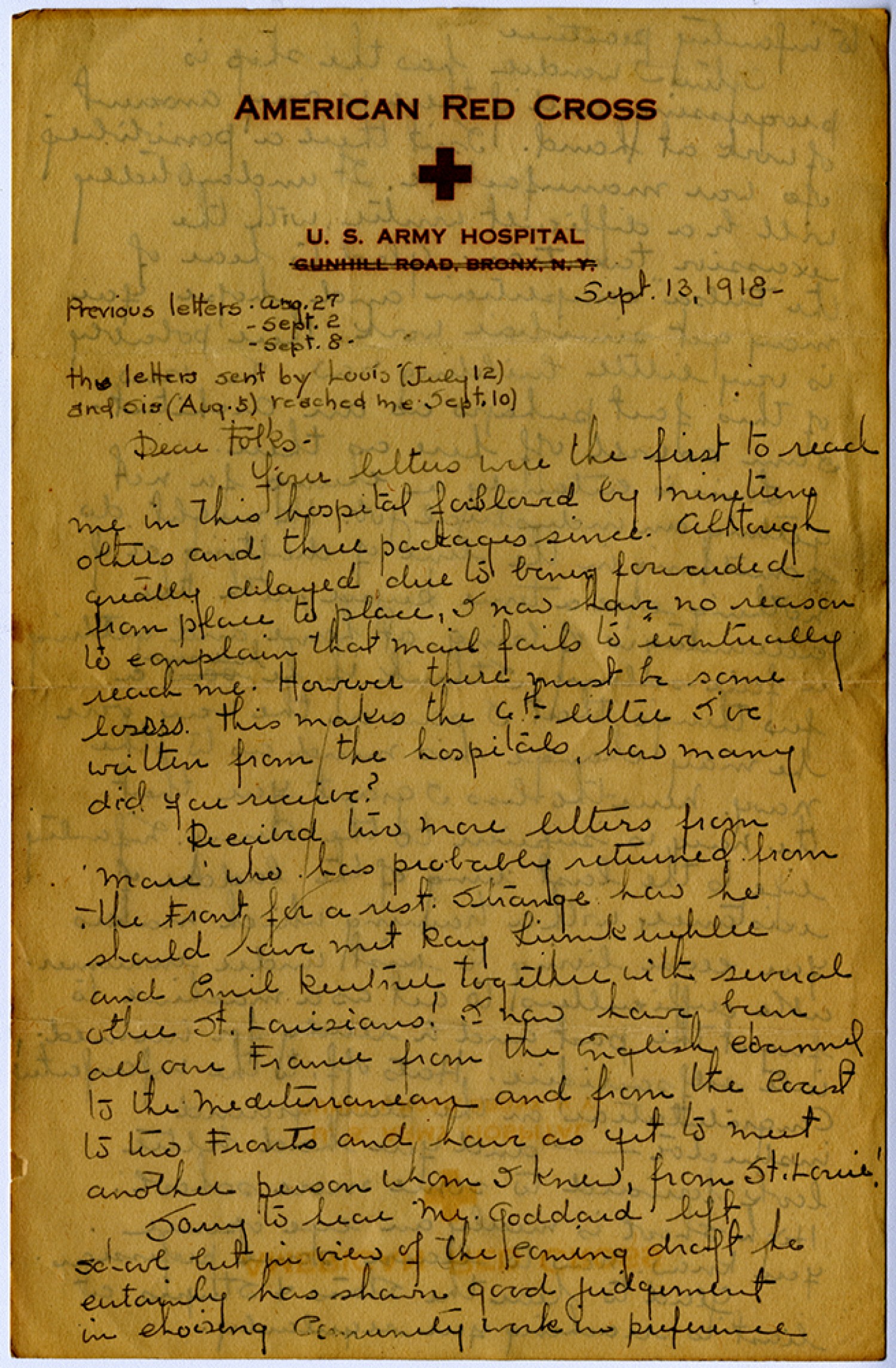 [September] 13, 1918 - Previous letters – [August] 27 – [September] 2 – [September] 8 – the letters sent by Louis (July 12) and Sis ([August] 5) reached me [September] 10) Dear Folks - Your letters were the first to reach me in this hospital followed by nineteen others and three packages since. Although greatly delayed due to being forwarded from place to place, I now have no reason to complain that mail fails to eventually reach me. However there must be some losses. This makes the 6th letter I’ve written from the hospitals, how many did you receive? Received two more letters from ‘Marc’ who has probably returned from the Front for a rest. Strange how he should have met Ray Liumkehlee and Emil Reutnee together with several other St. Louisians! I now have been all over France from the English Channel to the Mediterranean and from the Coast to two Fronts and have as yet to meet another person whom I knew, from St. Louis! Sorry to hear Mr. goddard left school but in view of the coming draft he certainly has shown good judgement in choosing community work in preference