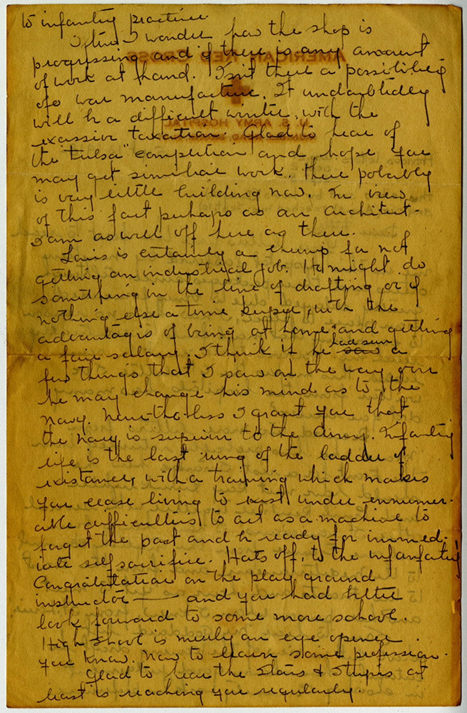 to infantry practice. Often I wonder how the shop is progressing and if their is any amount of work at hand. Isn’t there a possibility of a war manufacture. It undoubtedly will be a difficult winter with the excessive taxation. glad to hear of the “Tulsa” competition and hope you may get similiar work. There probably is very little building now. In view of this fact perhaps as an Architect I am as well off here as there. Louis is certainly a chump for not getting an industrial job. He might do something in the line of drafting or if nothing else a time keeper, with the advantages of being at home and getting a fair salary. I think if he had seen a few things that I saw on the way over he may change his mind as to the Navy. Never-the-less I grant you that the Navy is superier to the Army. Infantry life is the last rung of the ladder of existance, with a training which makes you cease living to exist under ennumerable difficulties to act as a machine to forget the past and be ready for immediate self sacrifice. Hats off, to the infantry! Congratulations on the play ground instructor – and you had better look forward to some more school. High School is merely an eye opener you know. Now to learn some profession. glad to hear the Stars & Stripes at least is reach you regularly.