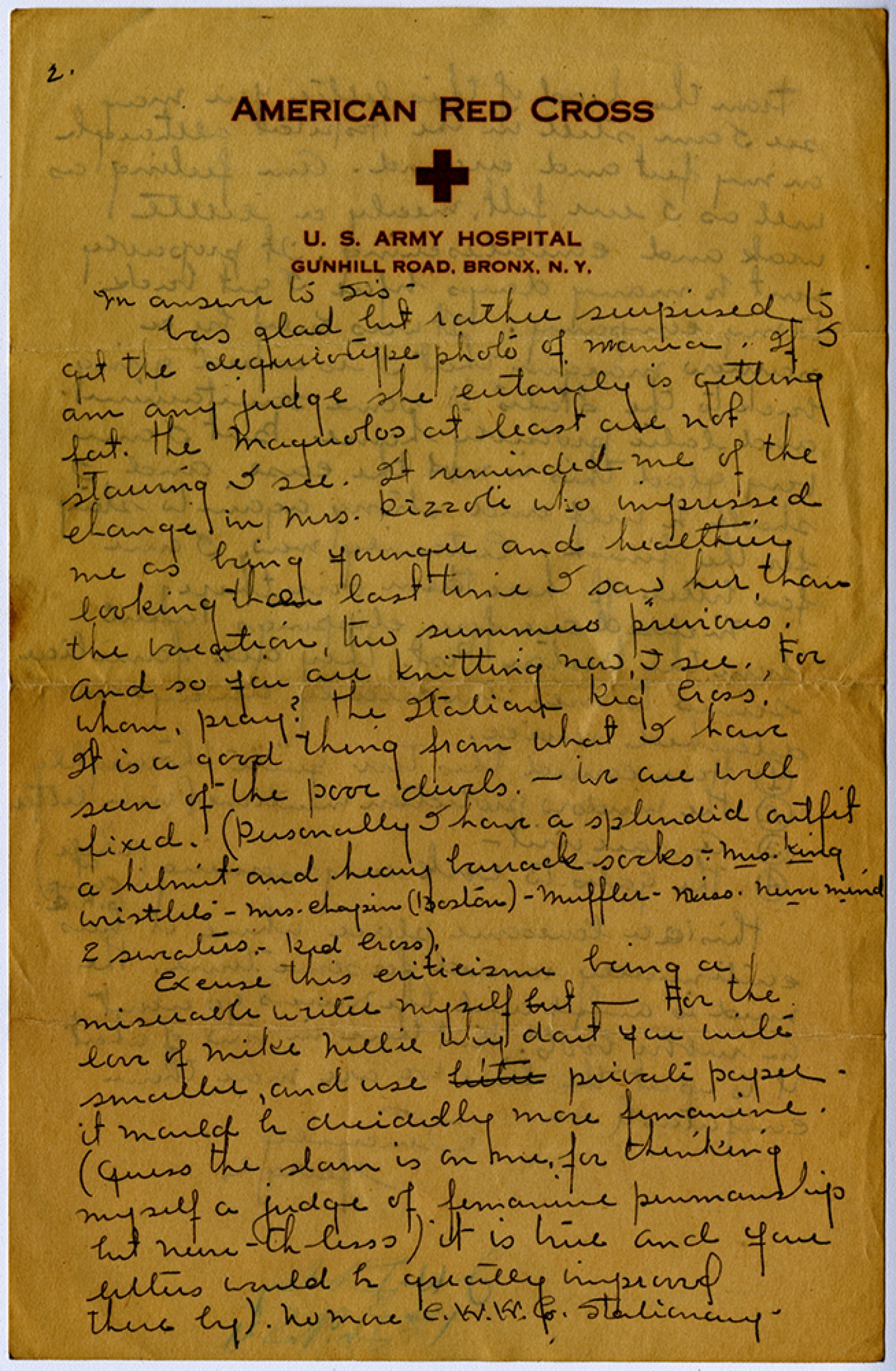 [page 2] In answer to Sis - was glad but rather surprised to get the deguirotype photo of Mama. If I am any judge she certainly is getting fat. The Maguolos at least are not starving I see. It reminded of the change in Mrs. Rizzoli who impressed me as being younger and healthier looking that last time I saw her than the vacation, two summers previous. and so you are knitting now, I see. For whom, pray? The Italian Red Cross. It is a good thing from what I have seen of the poor devils. – We are well fixed. (Personally I have a splendid outfit a helmet and heavy barrack socks – Mrs. King wristlets – Mrs. Chapin (Boston) – Muffler (Miss never mind 2 sweaters – Red Cross). Excuse this criticism being a miserable writer myslef but - for the love of Mike Nellie why don’t you write smaller, and use private paper – it would be decidedly more femanine, (Guess the slam is on me for thinking myself a judge of femanine penmanship but never-the–less) it is true and your letters would be greatly improved there by). No more C. K. K. Co. Stationary.