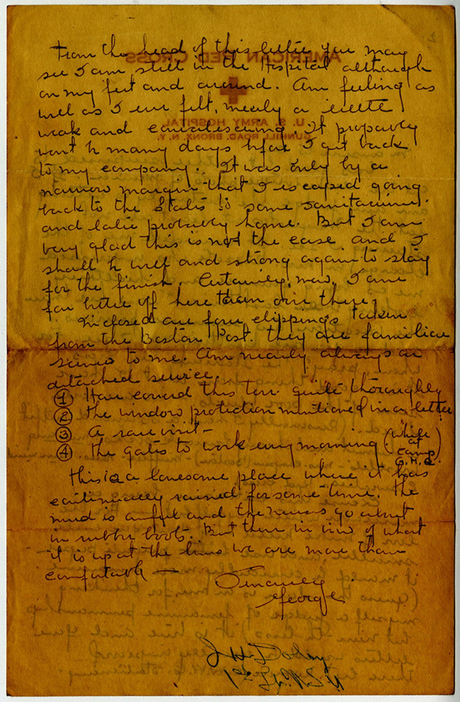 From the head of this letter you may see I am still in the hospital although on my feet and around. Am feeling as well as I ever felt, merely a little weak and convalescing. It probably wont be many days before I get back to my company. It was only by a narrow margin that I escaped going back to the States to some sanitarium and later probably home. But I am very glad this is not the case and I shall be well and strong again to stay for the finish. Certainly now, I am far better off here than over there. Inclosed are four clippings taken from the Boston Post. They are familiar scenes to me. Am nearly always on detached service. 1 Have covered this Terr. quite thoroughly 2. The window protection mentioned in a letter 3 a rare visit – 4 The gates to work every morning (while at Camp [General Headquarters] This is a lonesome place where it has continually rained for some time. The mud is awful and the nurses go about in rubber boots. But then in view of what it is up at the lines we are more than comfortable – Sincerely George [censors signature]