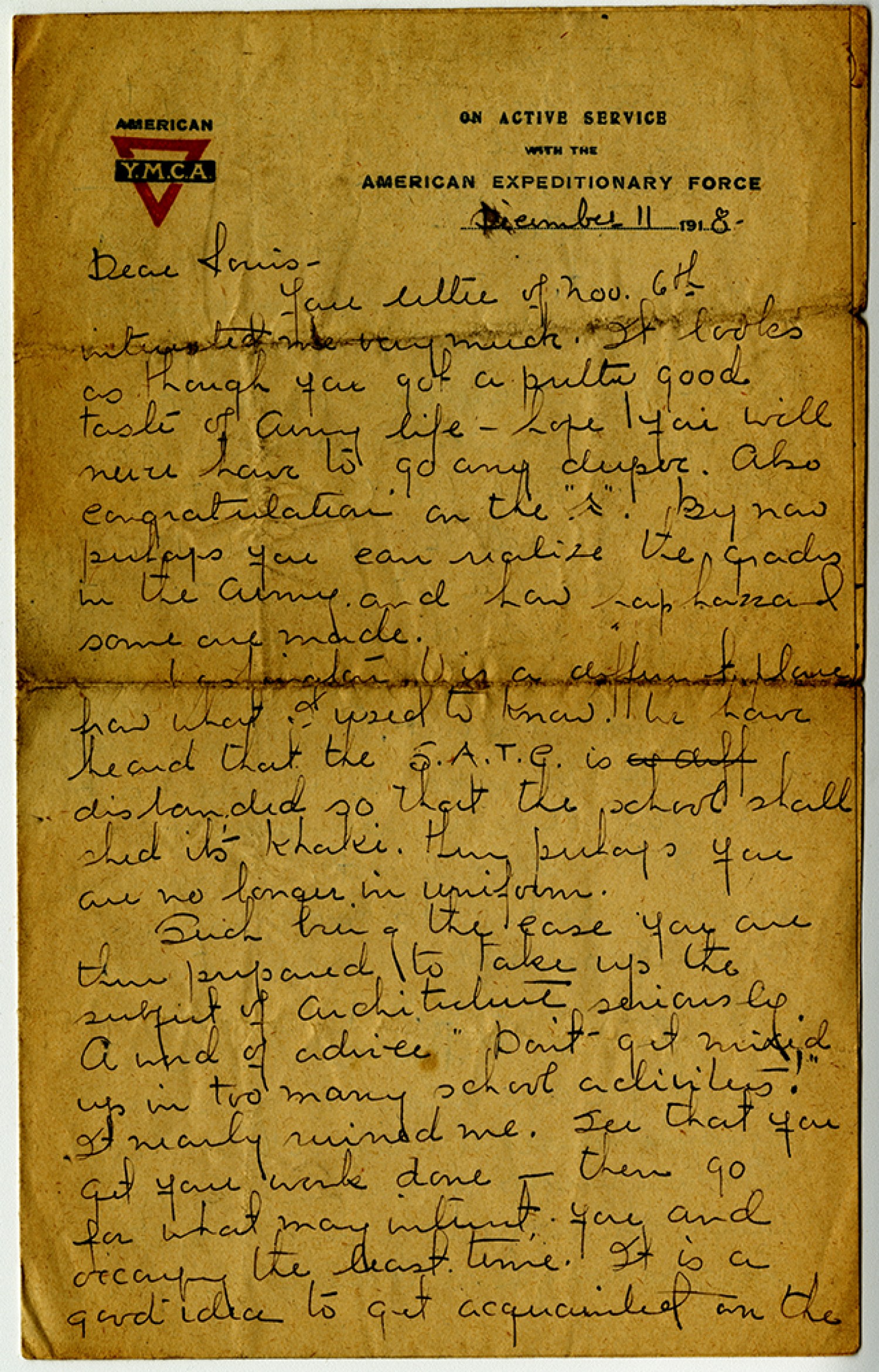 December 11, [1918] Dear Louis - your letter of [November] 6th interested me very much. It looks as though you got a pretty good taste of Army life – hope you will never have to go any deeper. Also congratulation on the [sketch of corporal rank]. By now perhaps you can realize the grades in the Army and how haphazzard some are made. Washington [University] is a different place from what I used to know. We have heard that the S.A.T.C. is disbanded so that the school shall shed its khaki. Then perhaps you are no longer in uniform. Such being the case you are then prepared to take up the subject of architecture seriously. A word of advice ‘Don’t get mixed up in too many school activities!” It nearly ruined me. See that you get your work done – then go for what may interest you and occupy the least time. It is a good idea to get acquainted on the