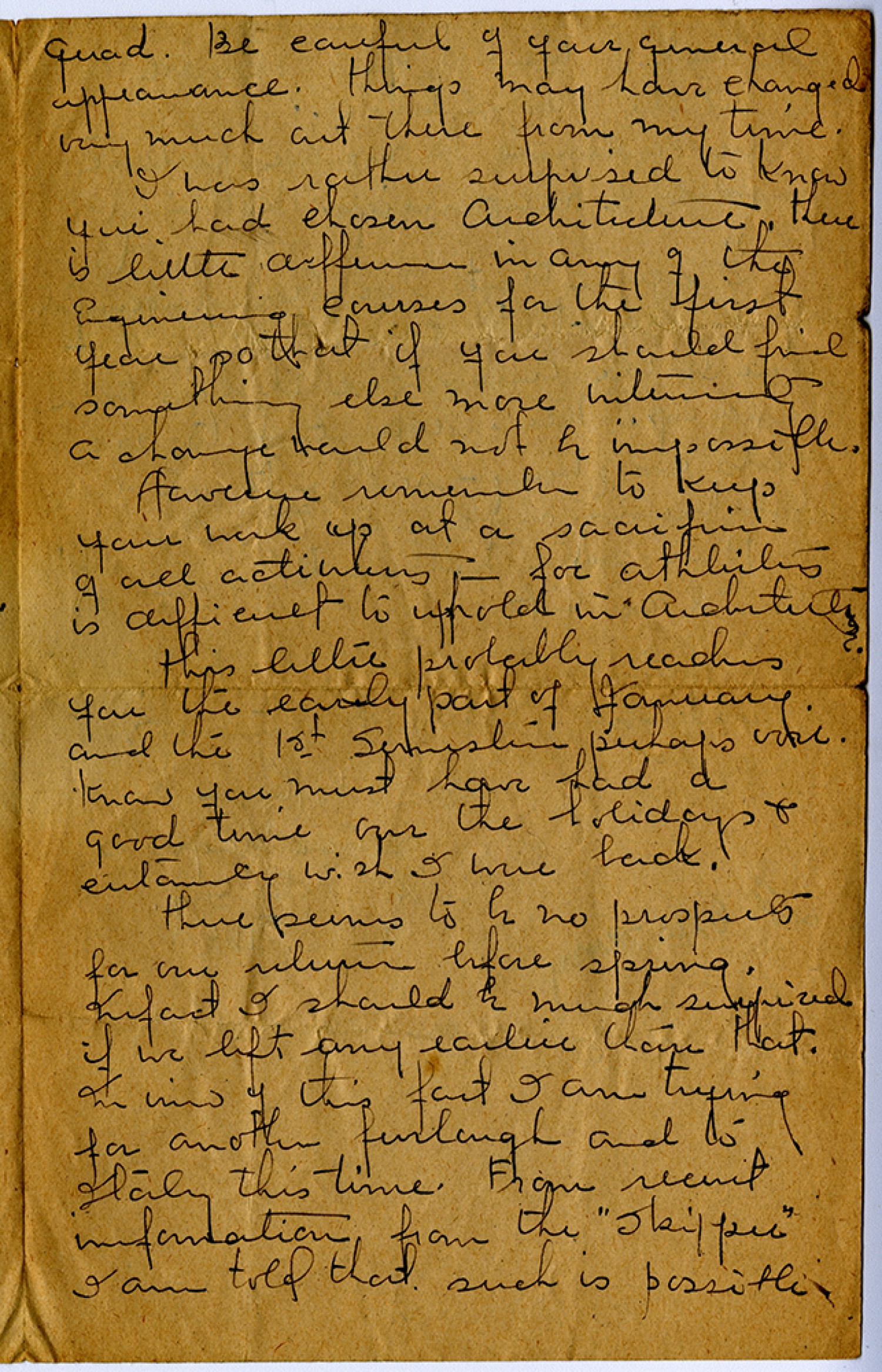 quad. Be careful of your general appearance. things may have changed very much out there from my time. I was rather surprised to know you had chosen Architecture. there is little difference in any of the Engineering courses for the first year so that if you should find something else more interesting a change would not be impossible. However remember to keep your work up at a sacrifice of all activities – for atheletics is difficult to uphold in Architecture. This letter probably reaches you for the early part of January. And the 1st semester perhaps over. Know you must have had a good time over the holidays & certainly wish I were back. There seems to be no prospects for our return before spring. Infact I should be much surprised if we left any earlier than that. In view of this fact I am trying for another furlough and to Italy this time. From recent information from the “Skipper” I am told that such is a possible.