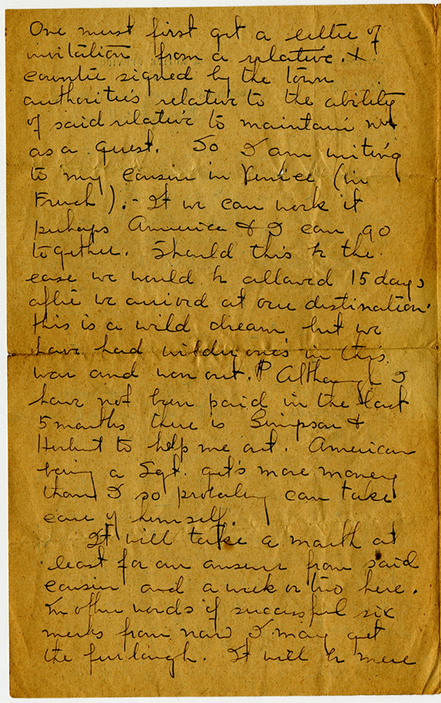 One must first get a letter of invitation from a relative. & Counter signed by the town authorities relative to the ability of said relative to maintain me as a guest. So I am writing to my cousin in Venice (in French). If we can work it perhaps America & I can go together. Should this be the case we would be allowed 15 days after we arrived at our destination. This is a wild dream but we have had wilder ones in this war and won out. Although I have not been paid in the last 5 months there is Simpson & Herbert to help me out. America being a [Sergeant] get’s more money than I so probably can take care of himself. It will take a month at least for an answer from said cousin and a week or two here. In other words if successful six weeks from now I may get the furlough. It will be mere