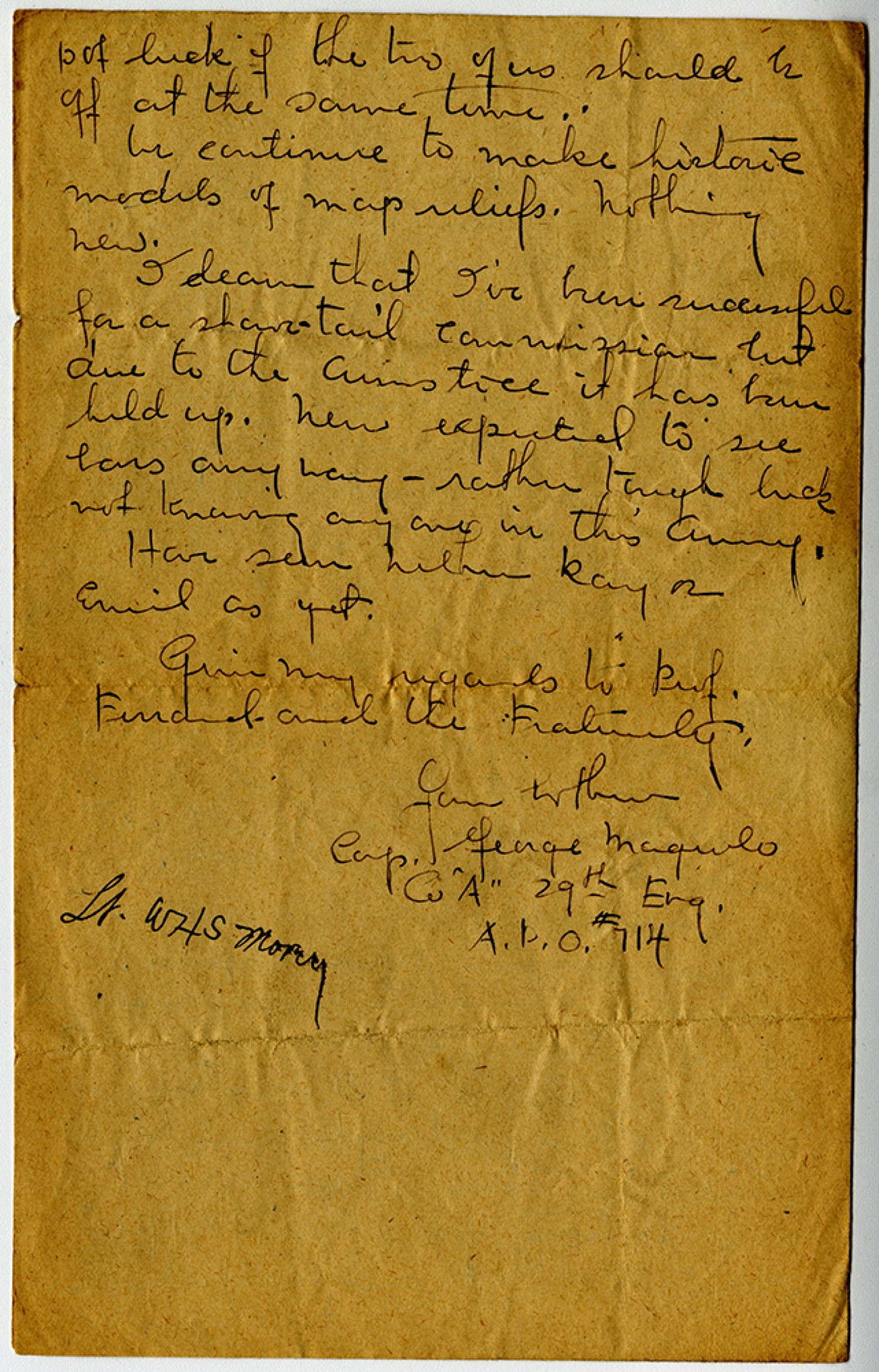 pot luck if the two of us should be off at the same time. We continue to make historic models of map reliefs. Nothing new. I deam that I’ve been successful for a [ms illegible: 2 wds] commission but due to the Armistice it has been held up. Never expected to see bars anyway – rather tough luck not knowing any one in the Army. Have seen neither Ray or Emil as yet. Give my regards to Prof. Ferrand and the Fraternity. Your brother [Corporal] George Maguolo Co “A” 29th [Engineers] A. P. O. #714 [censor’s signature]