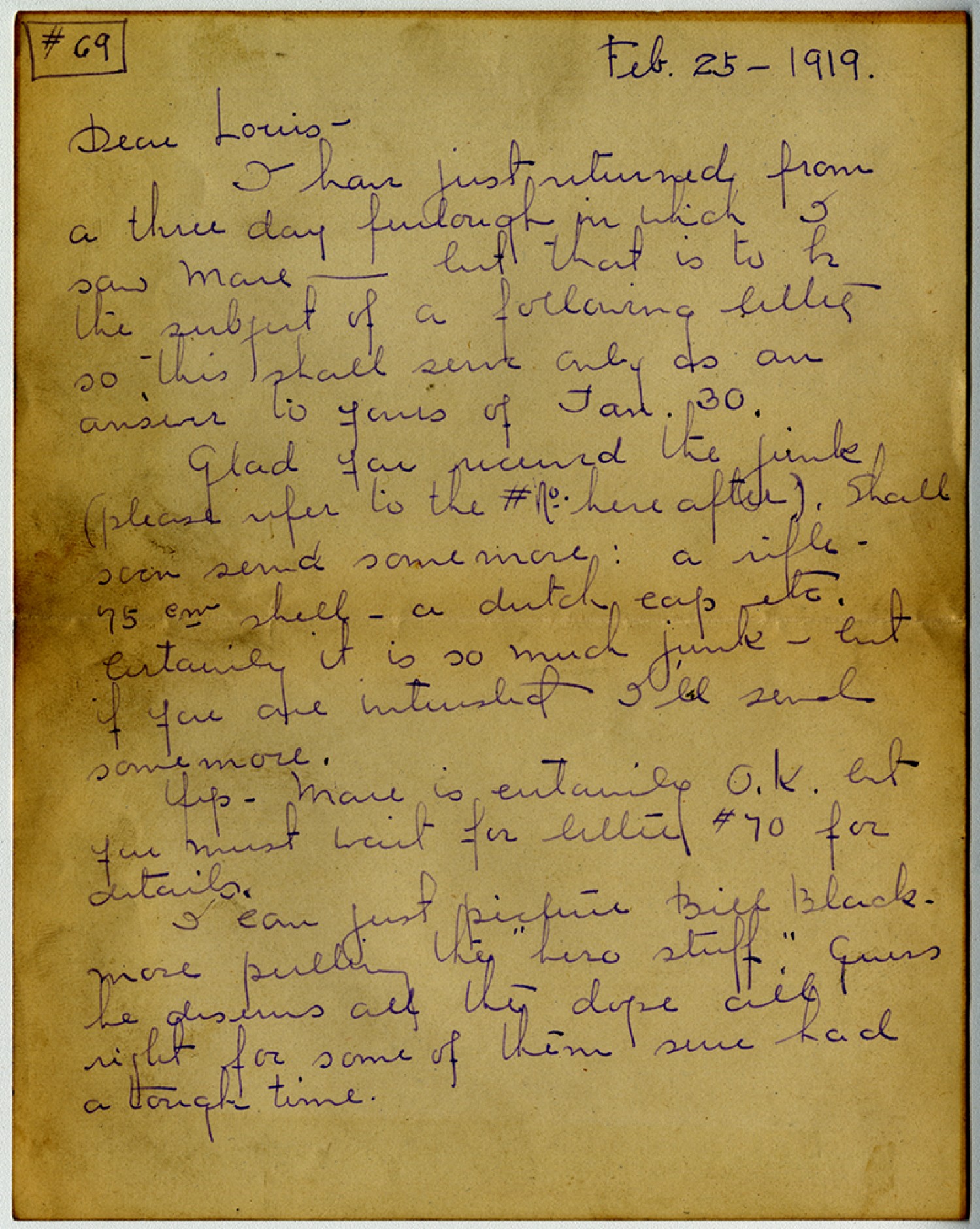 #69 [February] 25 – 1919. Dear Louis – I have just returned from a three day furlough in which I saw Mare – but that is to be the subject of a following letter so this shall serve only as an answer to yours of [January] 30. glad you received the junk (please refer to the #No. here after). Shall soon send some more: a rifle – 75 cm shell – a dutch cap etc. Certainly it is so much junk – but if you are interested I’ll send some more. Yep – Mare is certainly O. K. but you must wait for letter #70 for details. I can just picture Bill Blackmore pulling the “hero stuff.” guess he deserves all the dope all right for some of them sure had a tough time