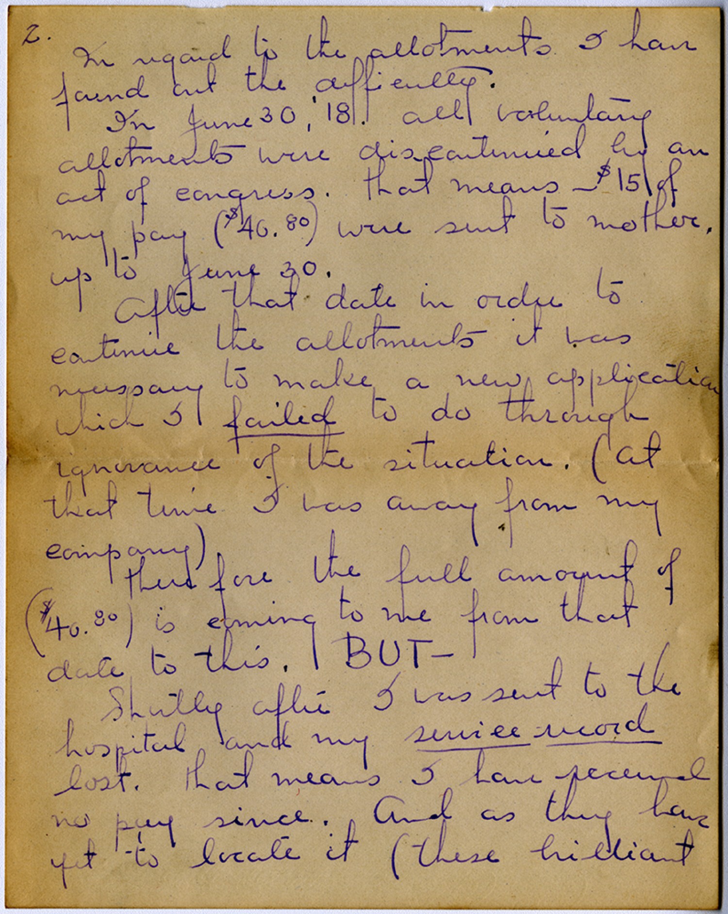 [page 2] In regard to the allotment I have found out the difficulty. In June 30, [1918] all voluntary allotments were discontinued by an act of congress. That means - $15 of my pay ($40. 80) were sent to mother up to June 30. After that date in order to continue the allotments it was necessary to make a new application which I failed to do through ignorance of the situation. (at that time I was away from my company) Therefore that full amount of ($40.80) is coming to me from that date to this BUT – Shortly after I was sent to the hospital and my service record lost. That means I have received no pay since. And as they have yet to locate it (these brilliant