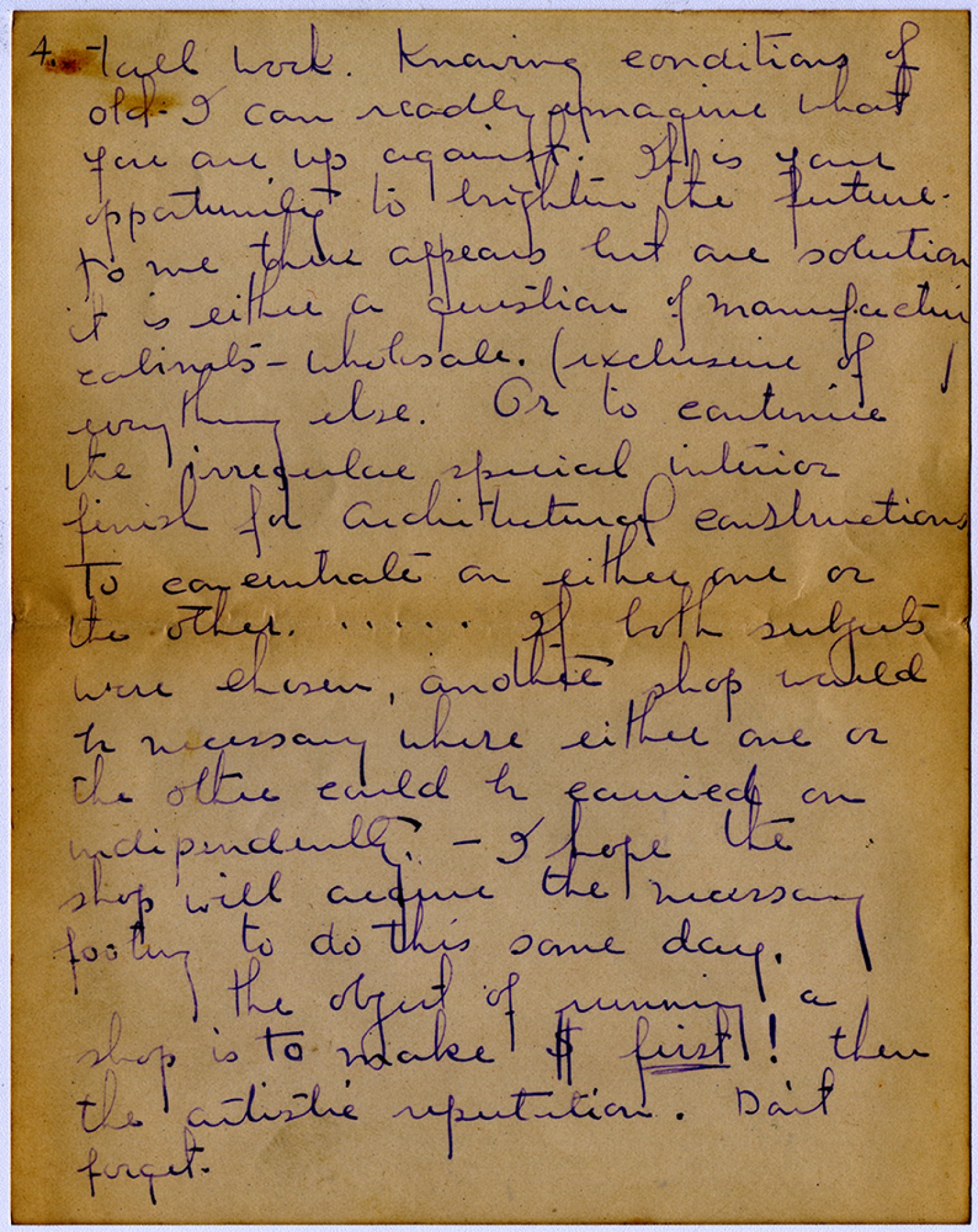 [page 4] tall work. Knowing conditions of old. I can readly imagine what you are up against. It is your opportunity to brighten the future. to me this appears but one solution it is either a question of manufacturing cabinets – wholesale. (exclusive of everything else. Or to continue the irregular special interior finish for architectural construction. To concentrate on either one or the other . . . . . If both subjects were chosen, another shop would be necessary where either one ore the other could be carried on independently – I hope the shop will acquire the necessary footing to do this some day. the object of running a shop is to make $ first! then the artistic reputation. Don’t forget.