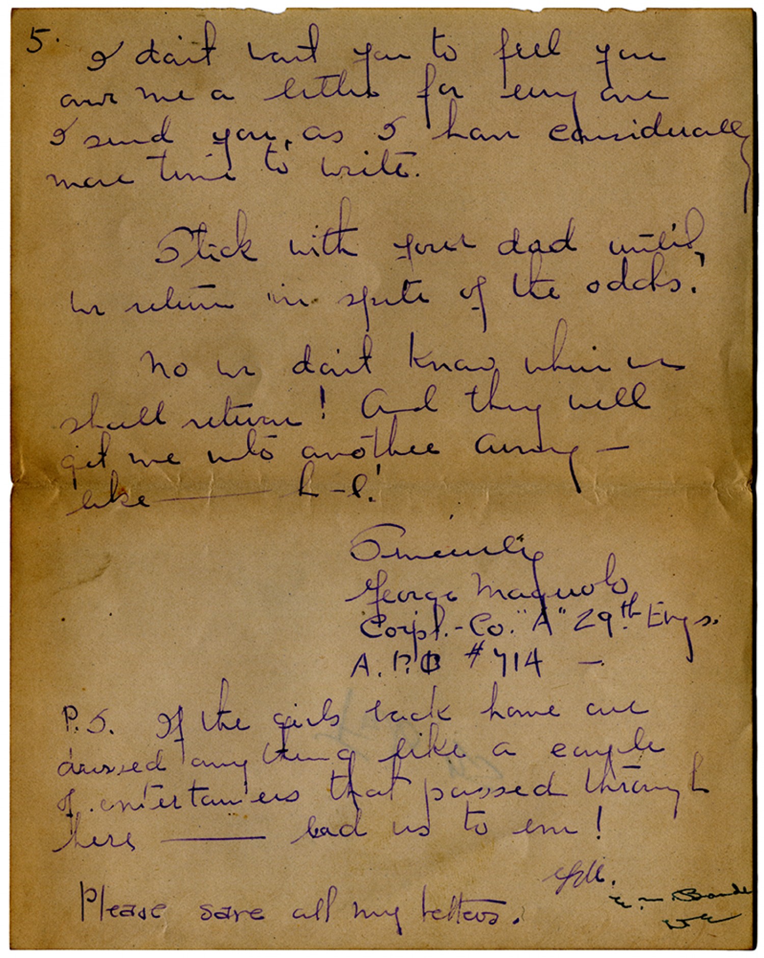 [page 5] I don’t want you to feel you owe me a letter for every one I send you, as I have considerably more time to write. Stick with your dad until we return in spite of the odds. No we don’t know when we shall return! And they will get me into another army like - h-l! Sincerley George Maguolo [Corporal] Co “A” 29th [Engineers] A.P.O. #714 - P.S. If the girls back home are dressed any thing like a couple of entertainers that passed through here – lead us to em! [George Maguolo] Please save all my letters. [censor’s signature]