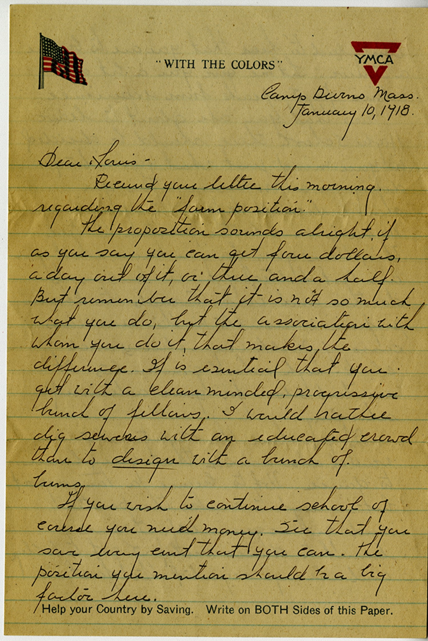 Camp Devens [Massachusetts] January 10, 1918. Dear Louis - Received your letter this morning regarding the “farm position.” The proposition sounds alright, if as you say you can get four dollars, a day out of it, or three and a half. But remember that it is not so much what you do, but the association with whom you do it, that makes the difference. It is essential that you get with a clean minded progressive bunch of fellows. I would rather dig sewers with an educated crowd than to design with a bunch of bums. If you wish to continue school of course you need money. See that you save every cent that you can. The position you mention should be a big factor here.