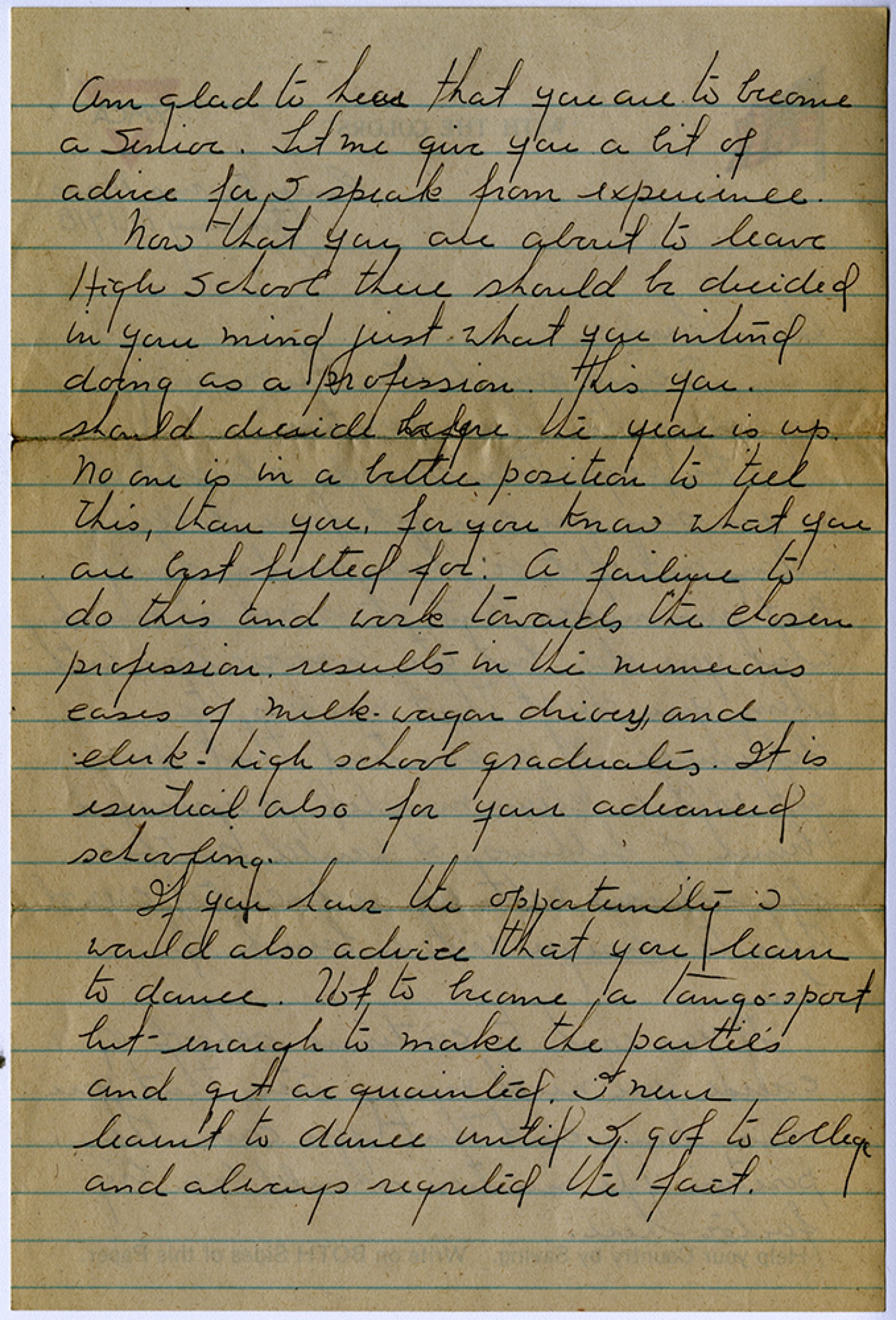 Am glad to hear that you are to become a senior. Let me give you a bit of advice for I speak from experience. Now that you are about to leave High School there should be decided in your mind just what you intend doing as a profession. This you should decide before the year is up. No one is in a better position to tell this, than you, for you know what you are best fitted for. A failure to do this and work towards the chosen profession results in the numerous cases of milk wagon driver, and clerk, high school graduates. It is esential also for your advanced schooling. If you have the opportunity I would also advise that you learn to dance. Not to become a tango-sport but enough to make the parties and get acquainted. I never learnt to dance until I got to college and always regreted the fact.