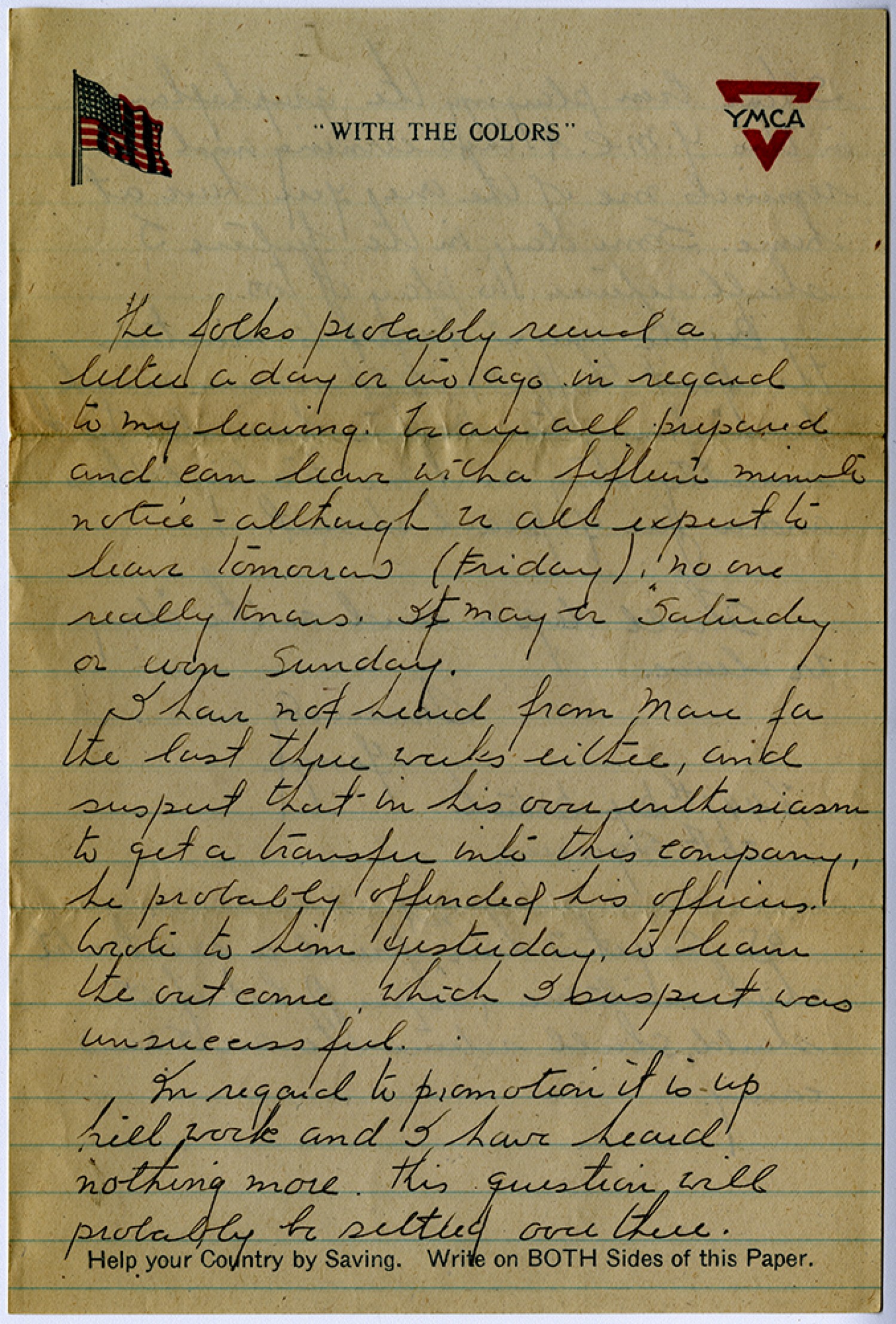 the folks probably received a letter a day or two ago in regard to my leaving. We are all prepared and can leave with a fifteen minute notice – allthough we all expect to leave tomorrow (Friday) no one really knows. It may be Saturday or even Sunday. I have not heard from Marc for the last three weeks either, and suspect that in his over enthusiasm to get a transfer into this Company, he probably offended his officers. Wrote to him yesterday to learn the outcome which I suspect was unsuccessful. In regard to promotion it is up hill work and I have heard nothing more. This question will probably by settled over there.